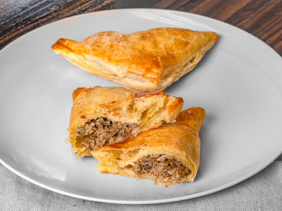 A traditional recipe of ground beef and lamb mixture of seasoning, served inside a flakey puff pastry shell. Fully cooked.