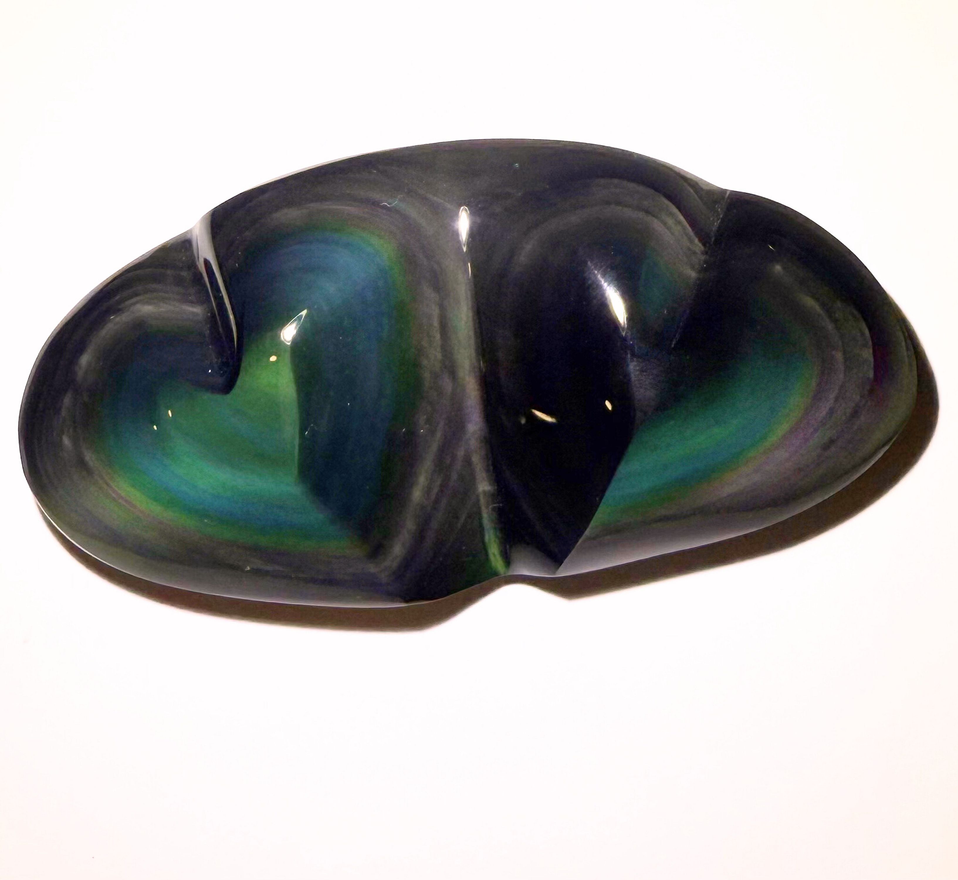 This exquisite Rainbow Obsidian piece features two hearts beautifully united in a single, perfectly sculpted form. One of a kind and full of depth, it displays mesmerizing natural colors that shift in the light. Obsidian is known as a powerful protective stone, helping to release emotional, physical, and spiritual blockages while grounding and restoring balance. Each piece is handcrafted by a skilled artisan in Teotihuacan, Mexico, making it not just a crystal, but a meaningful work of art.