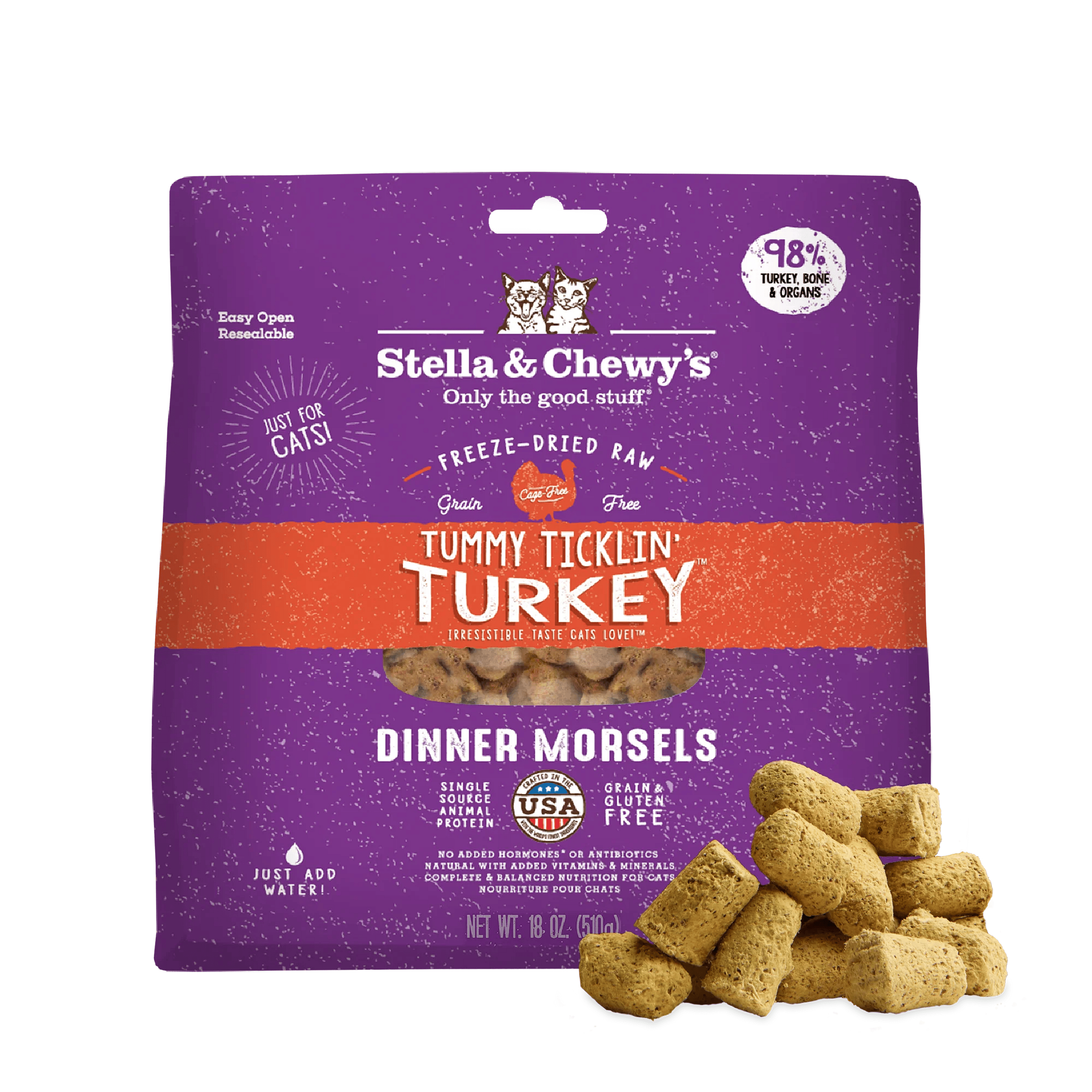 Stella & Chewy’s Tummy Ticklin’ Turkey Recipe for Cats is a protein-rich, freeze-dried raw meal made with responsibly sourced turkey and wholesome ingredients tailored for feline health. Easy to serve and irresistibly flavorful, it supports digestion, skin and coat health, and overall vitality in cats of all ages.