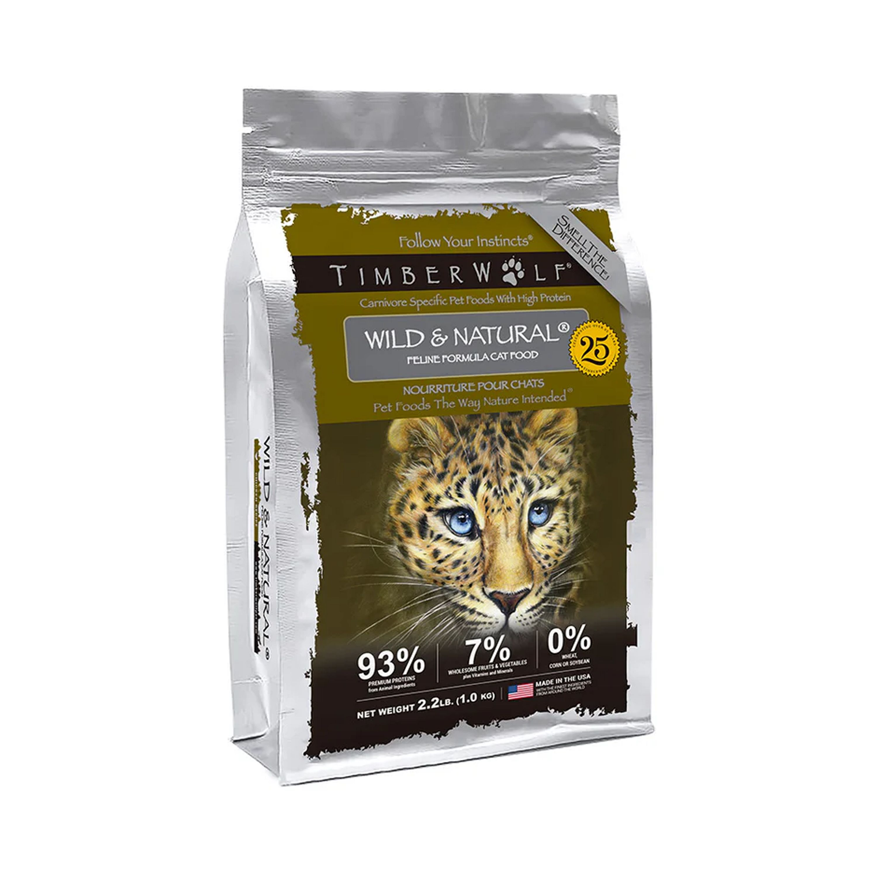 Timberwolf Wild & Natural Feline Legends – 2.2 lb is a high‑protein, grain‑free kibble crafted to mimic the instinctive diet of wild cats, featuring chicken, turkey, and fish meals for 93% animal‑based protein. Enriched with taurine, prebiotics, glucosamine, and chondroitin, it supports healthy digestion, joint function, and overall vitality — perfect for active cats and all life stages.