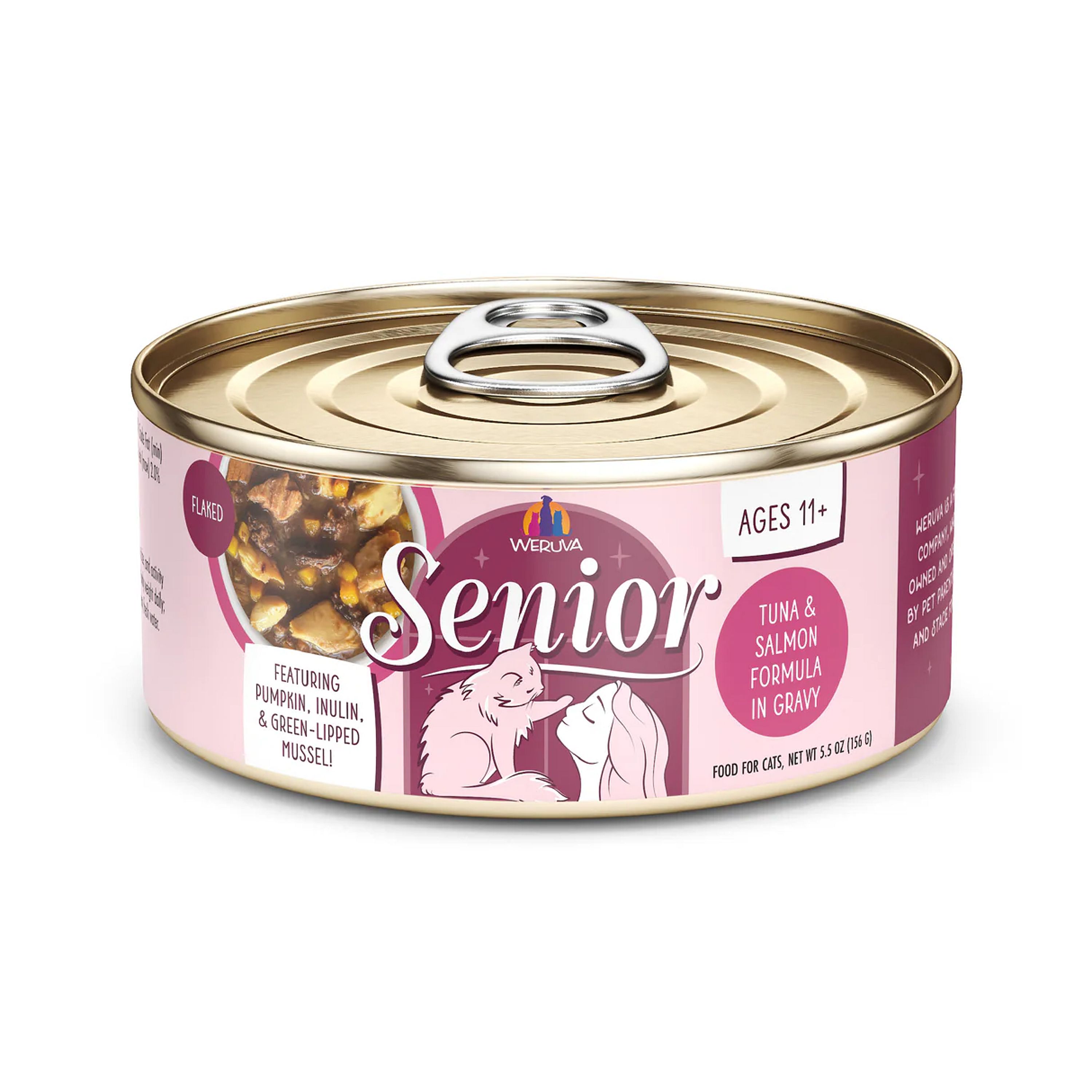 Weruva Senior 11+ Wet Cat Food offers high‑moisture, premium protein with recipes tailored for aging cats, featuring ingredients like chicken, tuna, or salmon. Enriched with green‑lipped mussel, pumpkin, and inulin, it supports joint health, digestion, and muscle maintenance to help older cats thrive.