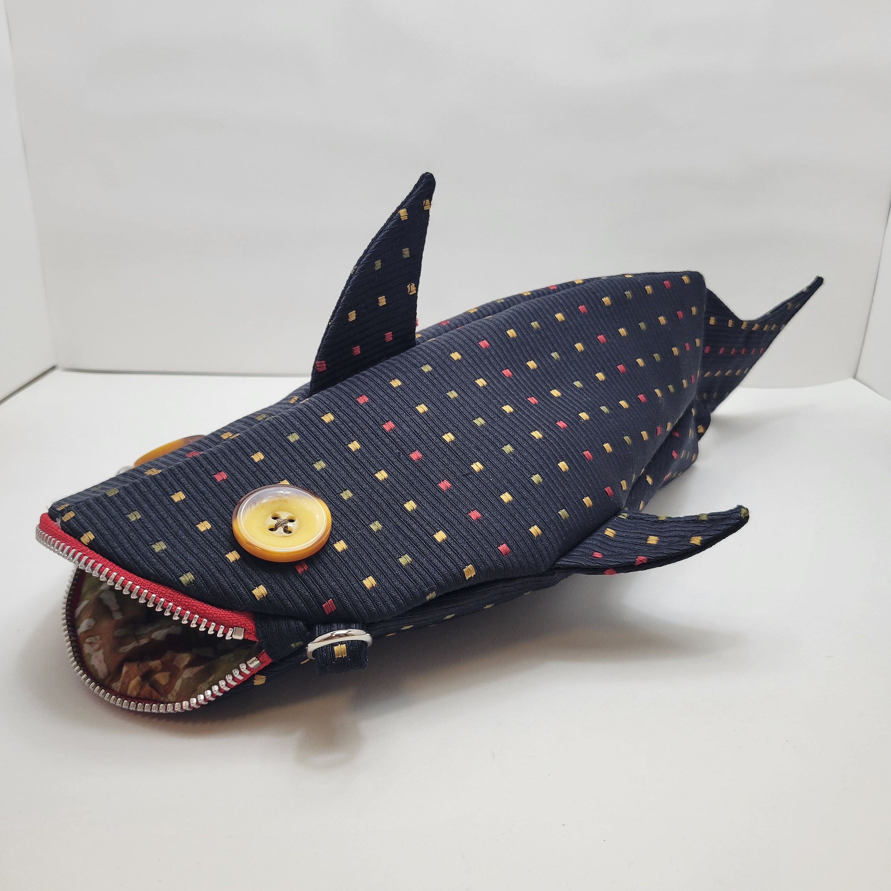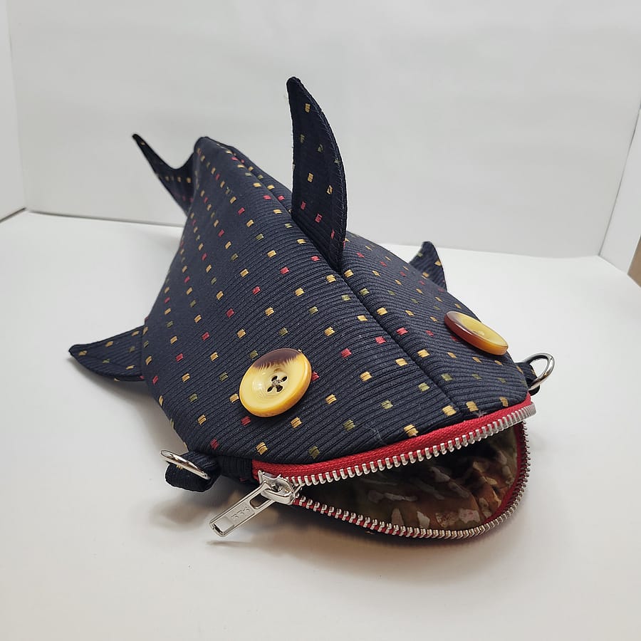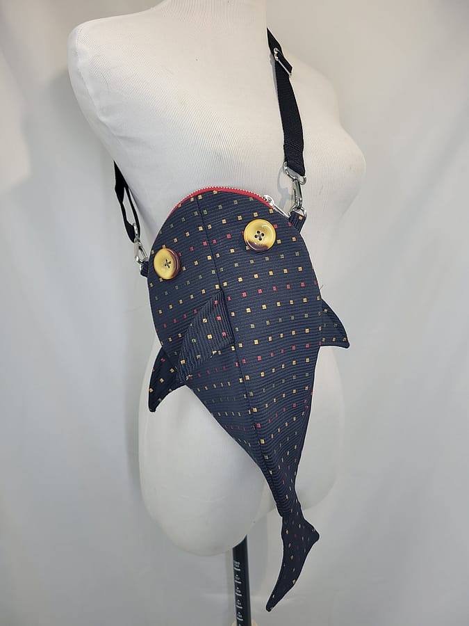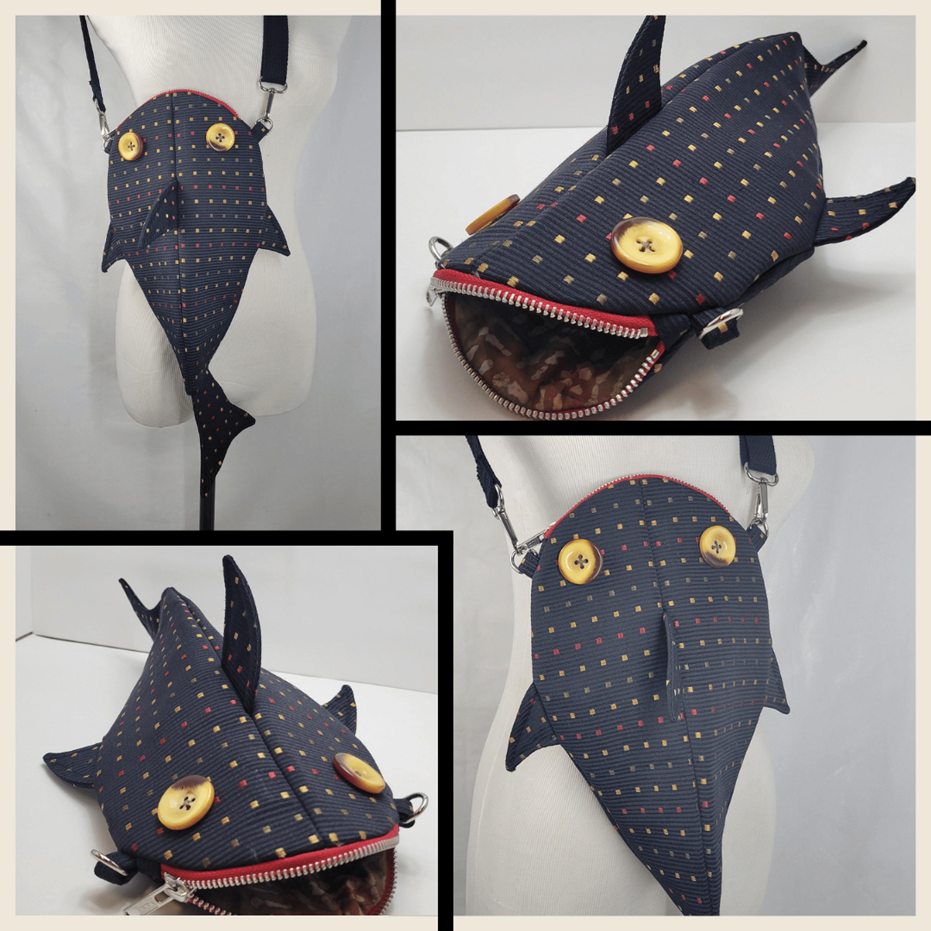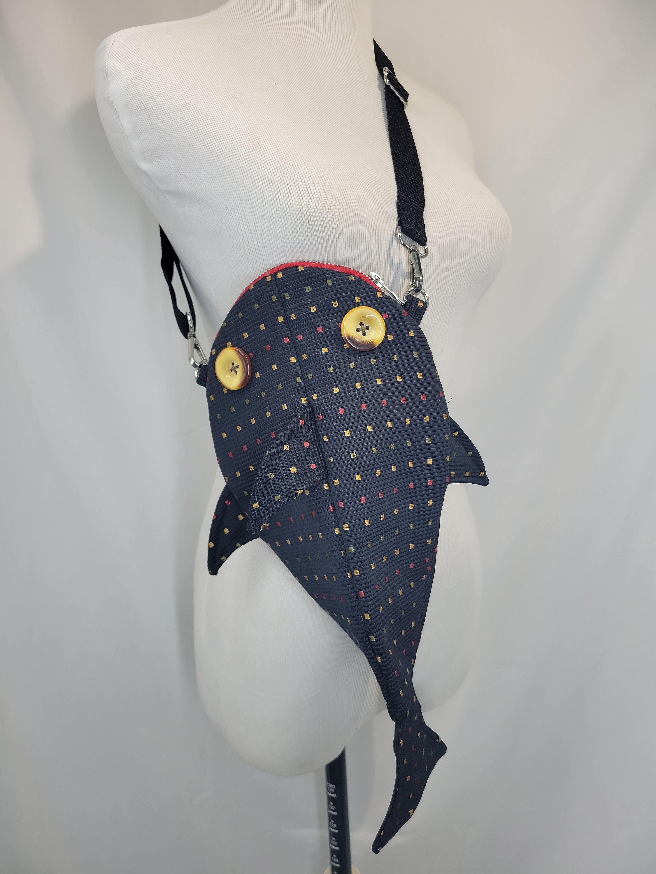 UnNaked Ape's wildly popular shark bag design, now available as a cross-body shark purse! Elegant, debonaire, hella sick, dude. Sized just right to hold your phone, wallet, keys, and a few other essentials. Ditch the frumpy tote bags at home and sport an aquatic style! Material: Up-cycled Cotton, up-cycled polyester, up-cycled metal or plastic zippers, polyester wedding. 2 Up-cycled Fashion Button eyes - of varying mediums based on availability Tip of nose to tip of tail 15" 6” wide body 6” zipper 12” internal pocket Adjustable 1" wide strap of polyester webbing measures from 37" to 69" with a 1" slider and 2 nickel plated swivel hooks Two 1/2" nickel plated D rings Hand wash cold with gentle detergent, hang dry with inner pocket pulled inside out
