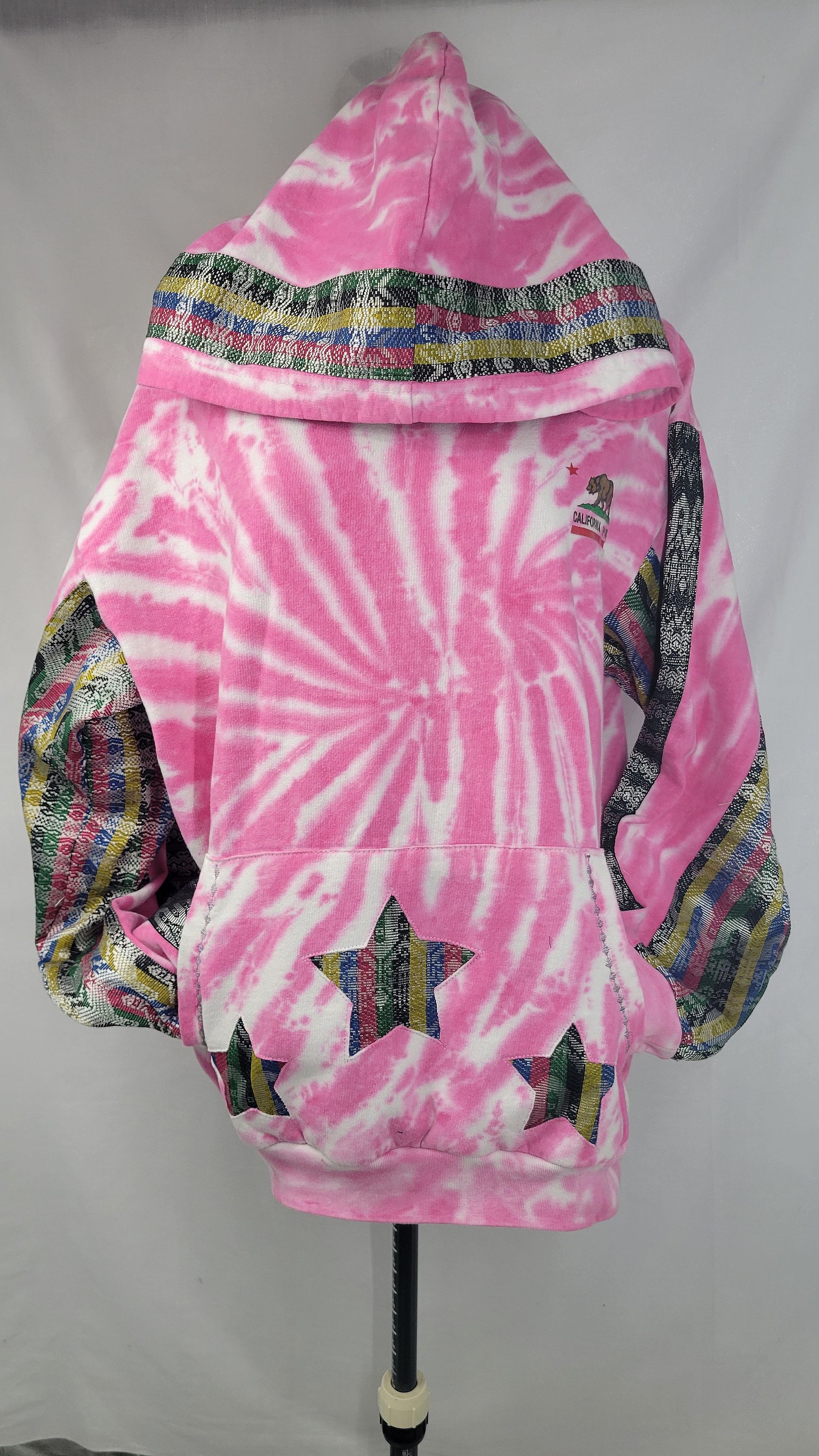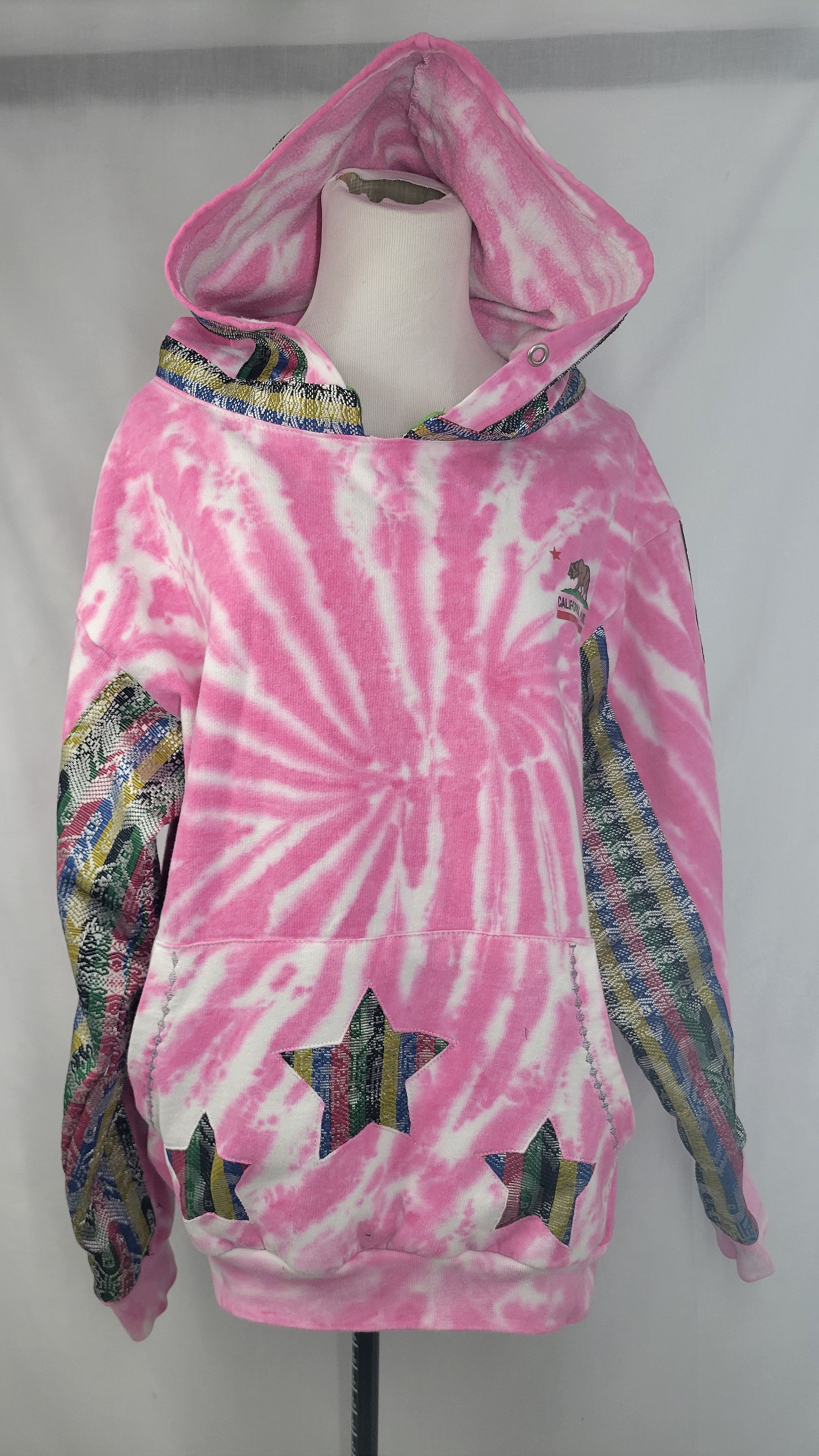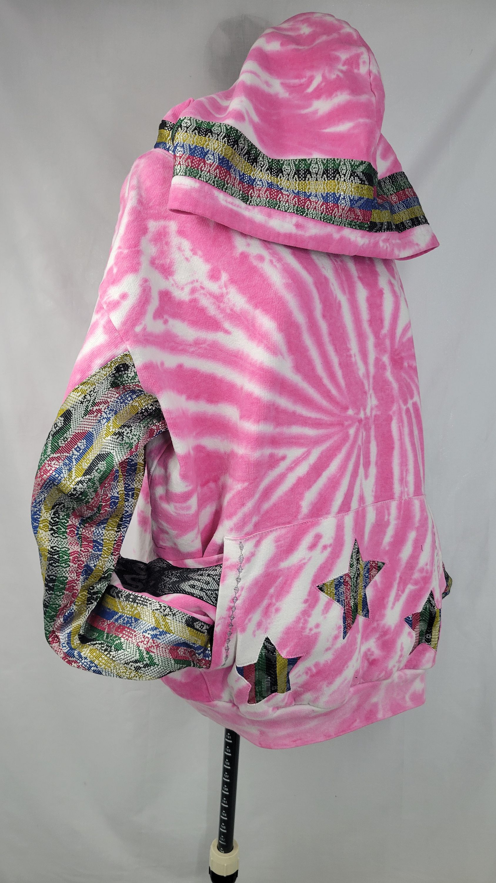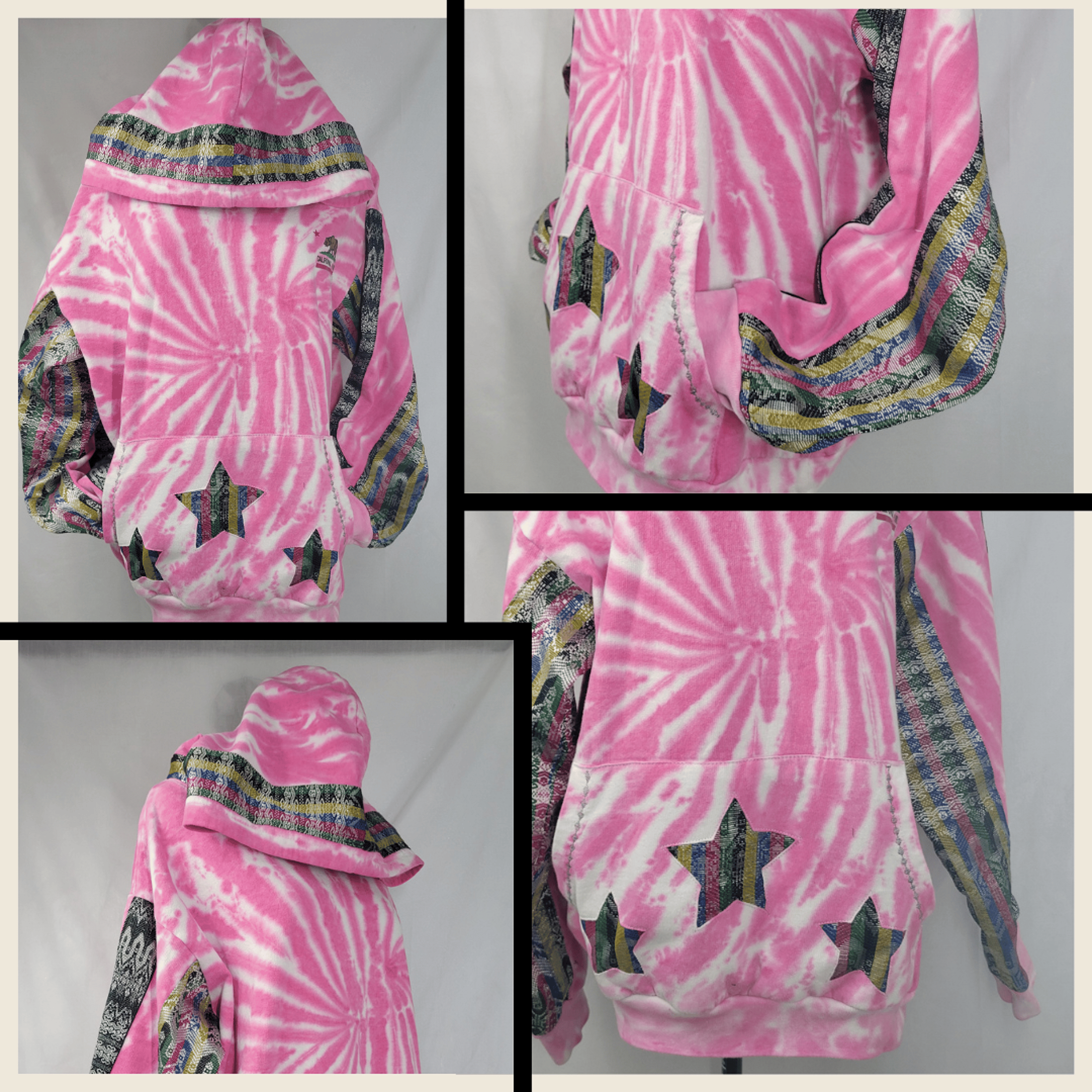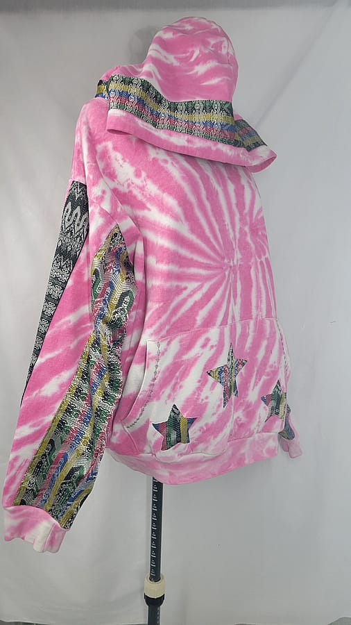 Live life with the boldness of Tie Dye, stars, and stripes! This Up-Cycled Woman’s Pullover Hoodie – Tie Dye Stars & Stripes is decorated with cut away stars and stripes made of 100% Indonesian cotton.