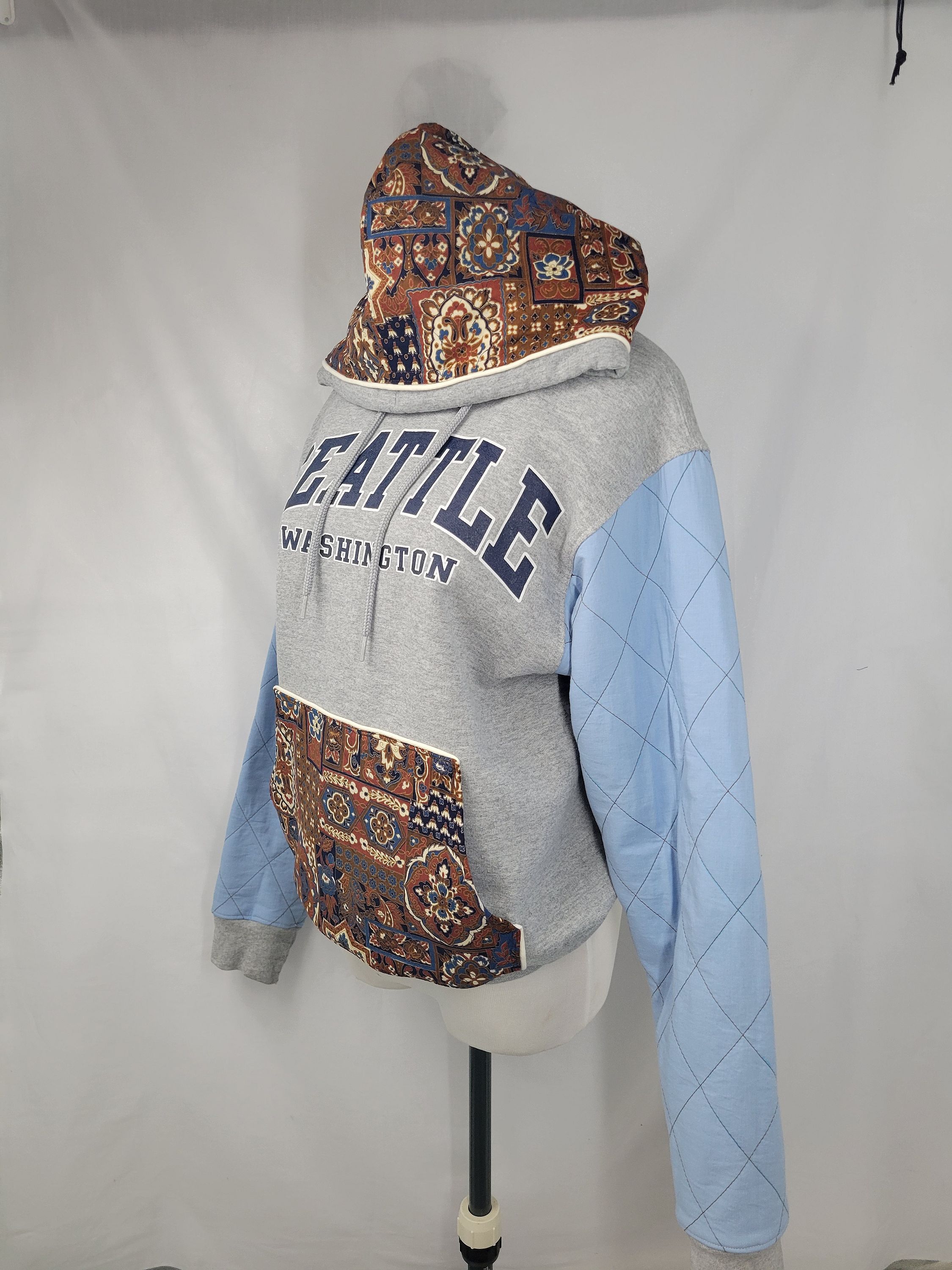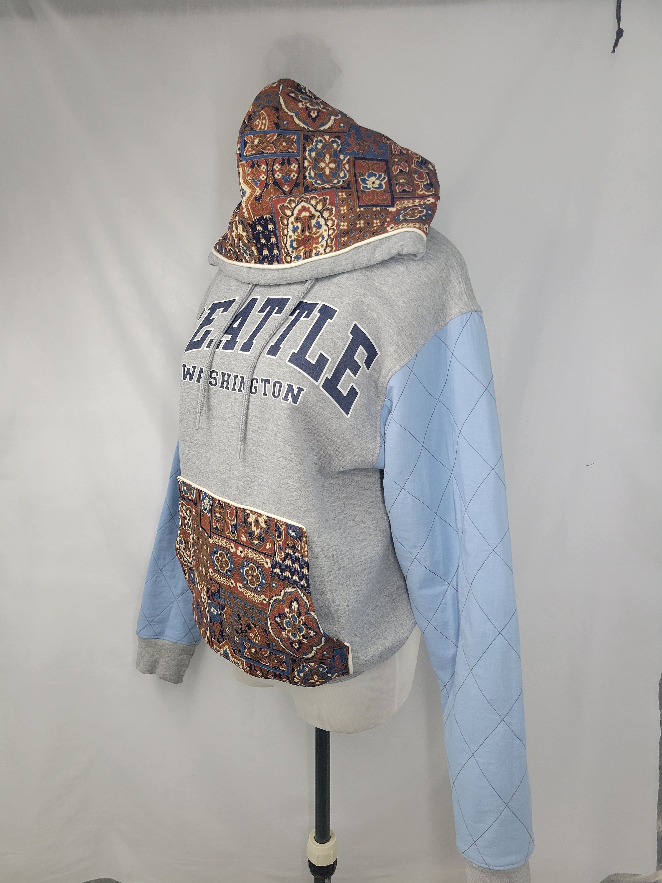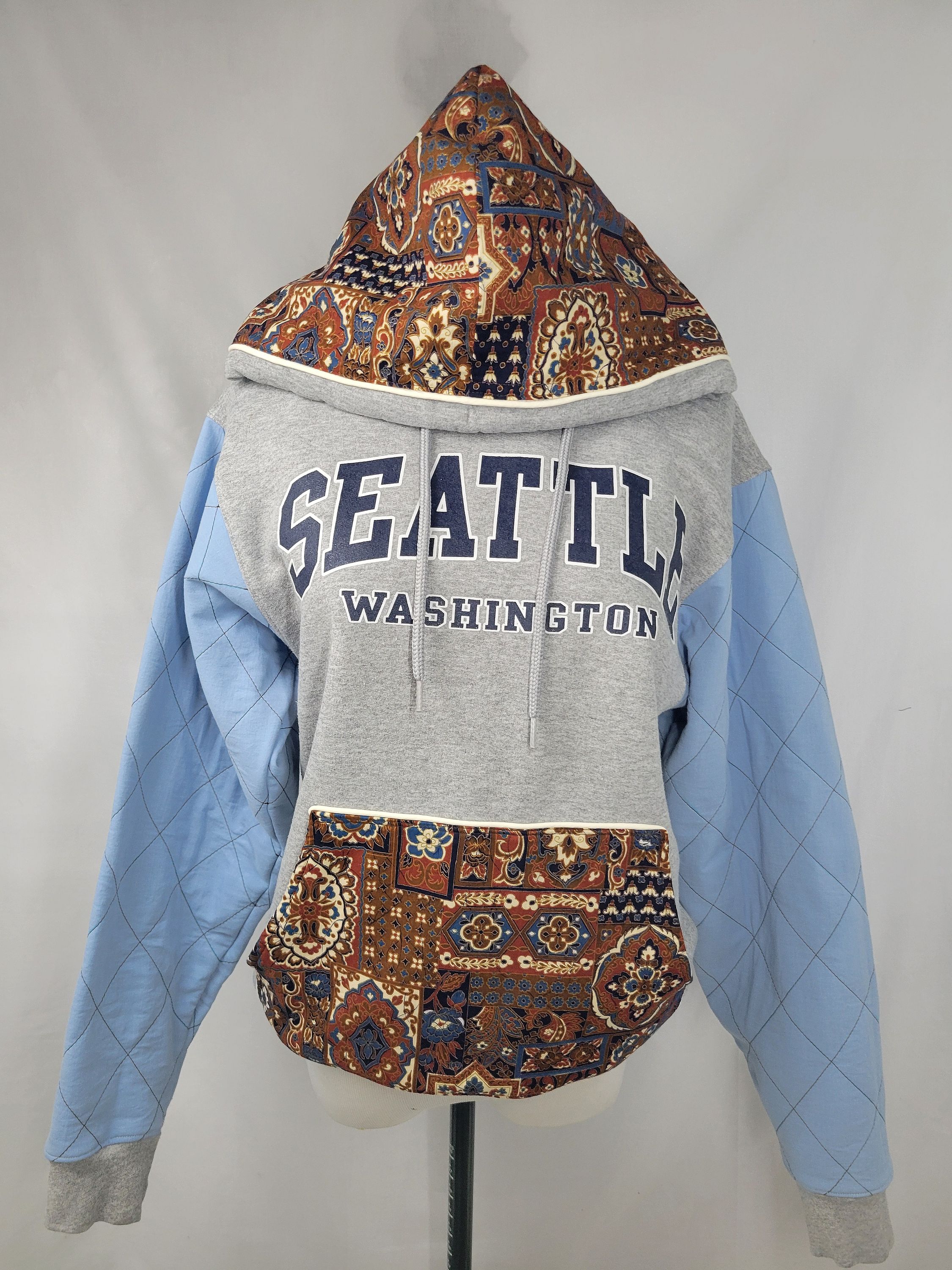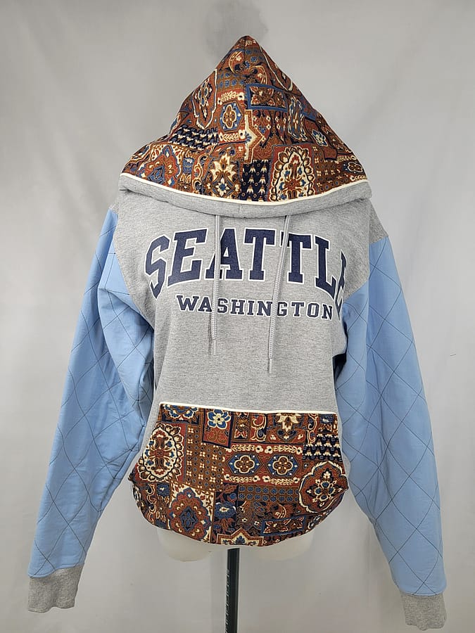 You will be bold in blue and brown sporting this Up-Cycled Woman's Pullover Hoodie Sweater - Paisley in Seatle. Quilt stitch blue sleeves with vintage print paisley hood and pocket for the dewy dawns!