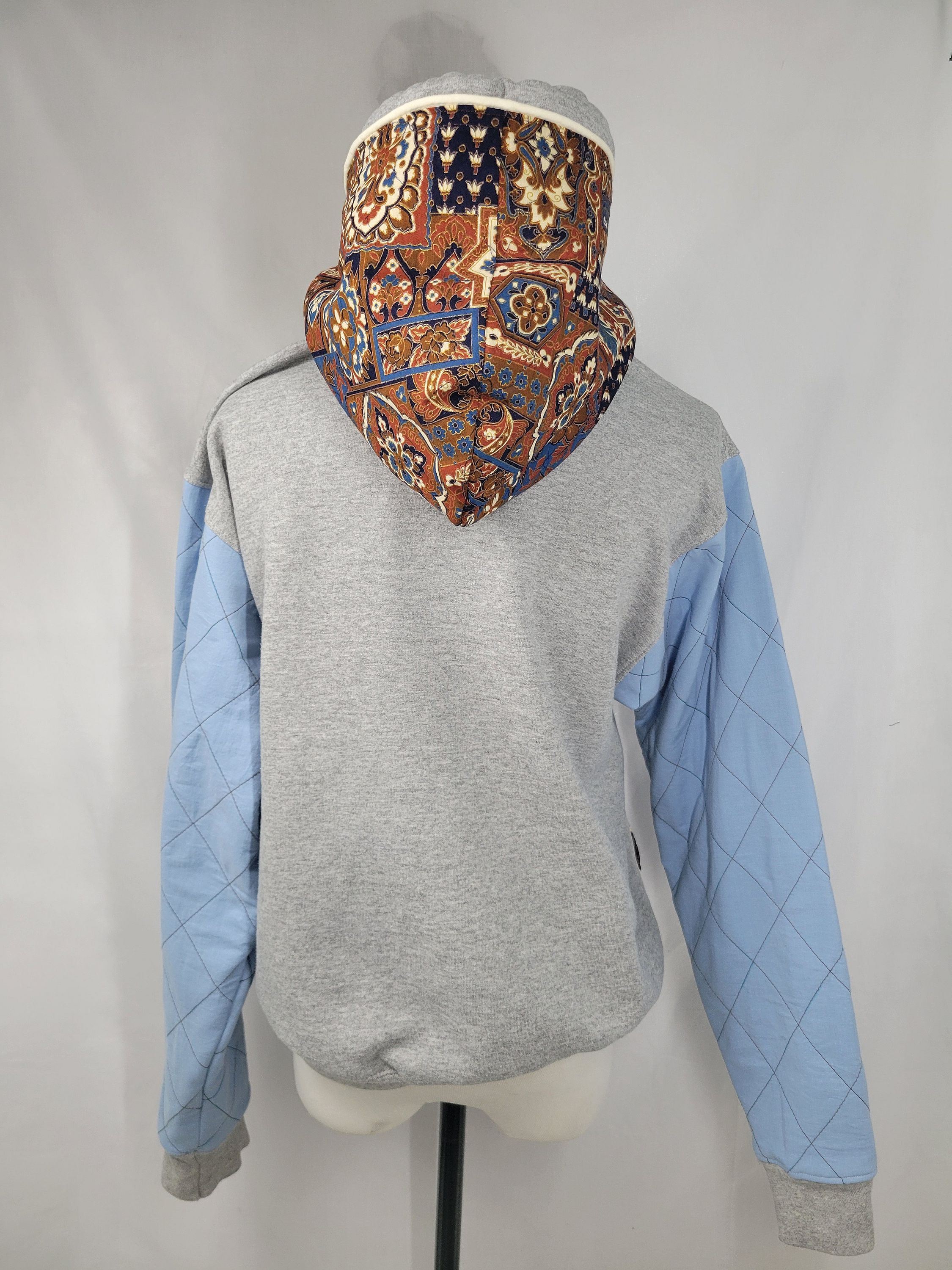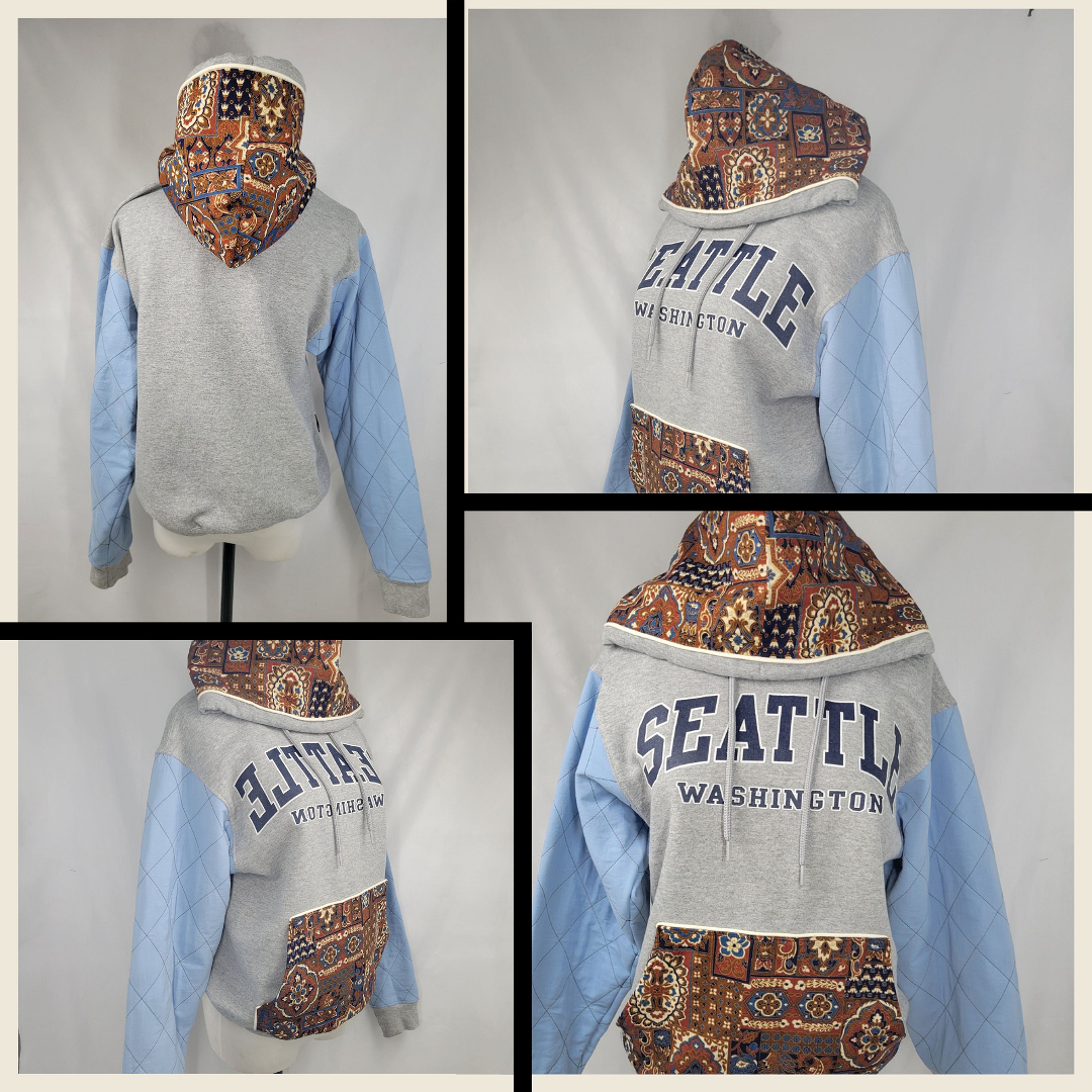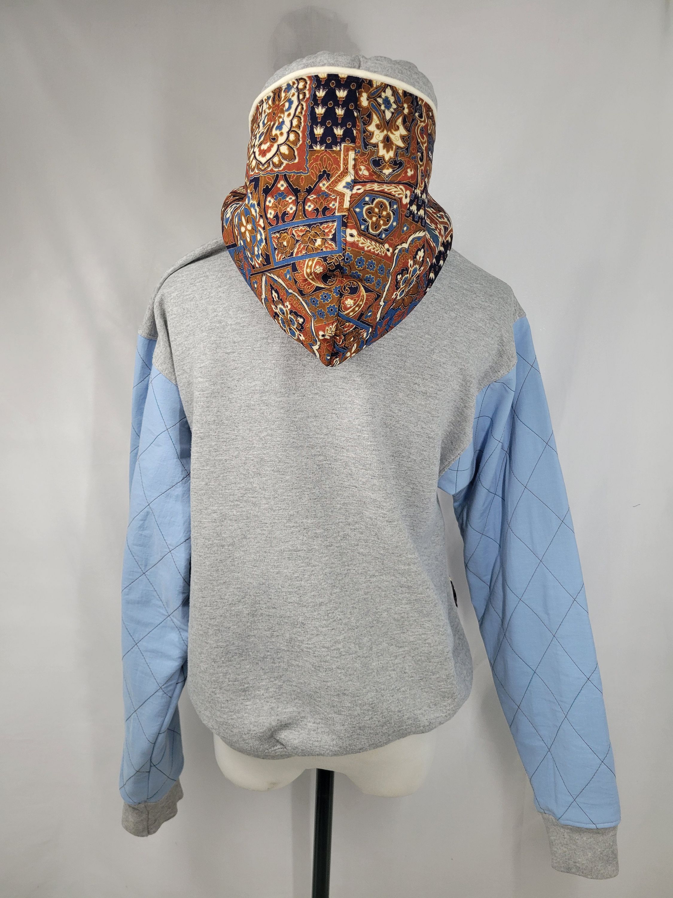 You will be bold in blue and brown sporting this Up-Cycled Woman's Pullover Hoodie Sweater - Paisley in Seatle. Quilt stitch blue sleeves with vintage print paisley hood and pocket for the dewy dawns!