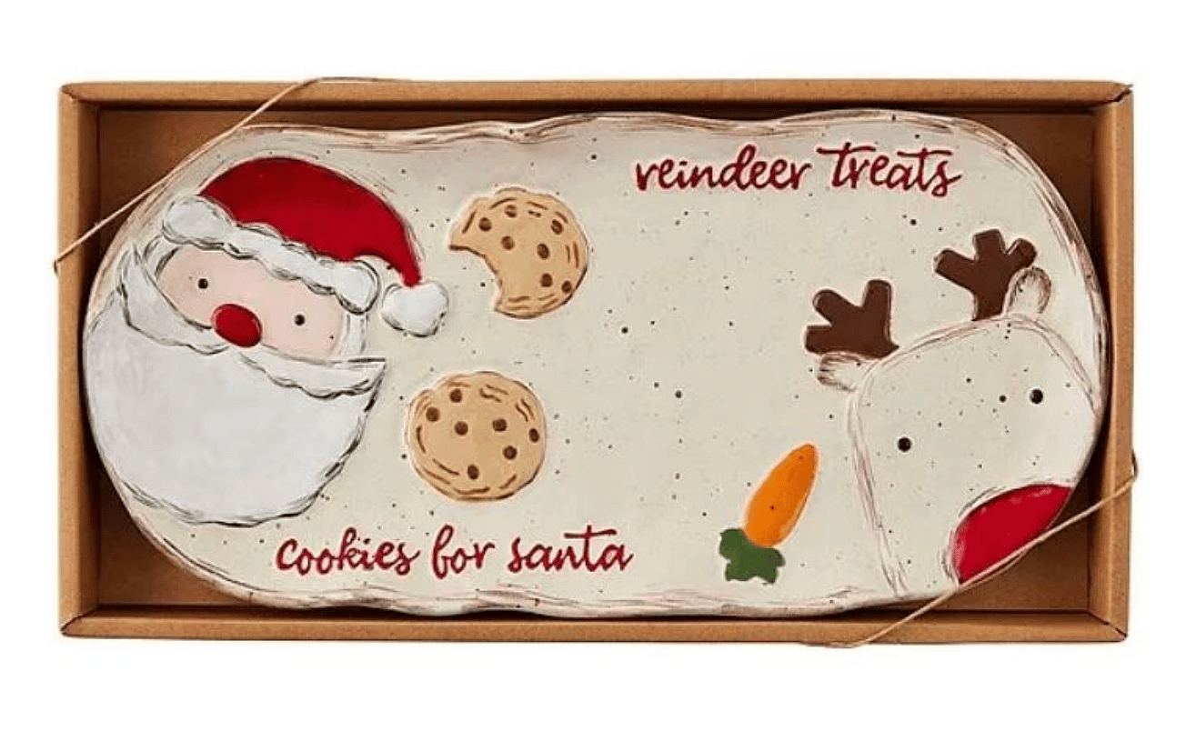 From Mud Pie, this reindeer platter features: Stoneware Farmhouse Christmas Collection Hand-painted detail Sentiment " reindeer treat" and "cookies for santa" Hand wash Measures approx. 5.75" x 11.5"