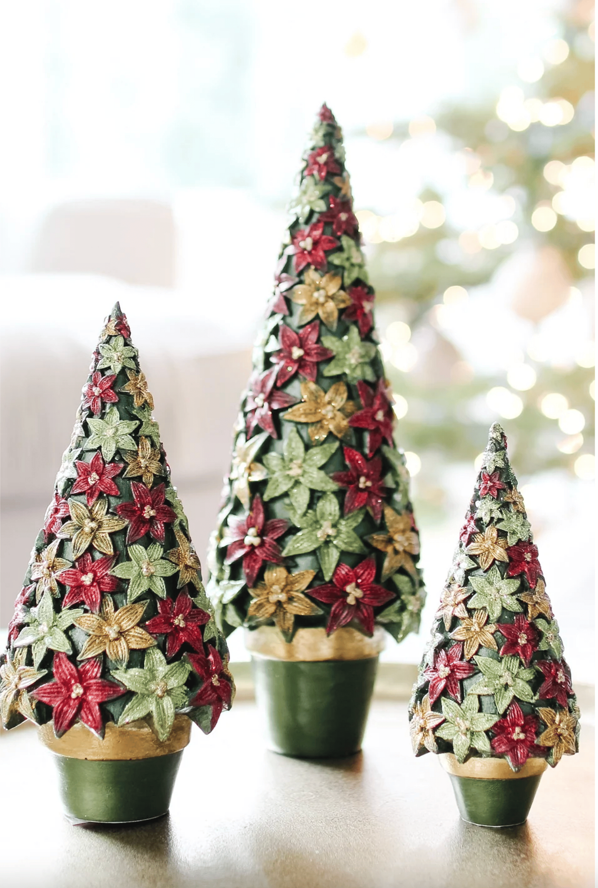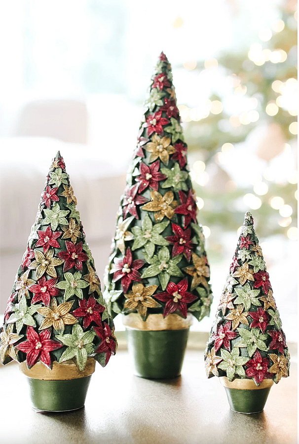 A festive tabletop tree embellished with layered stargazer poinsettias, the Dekorasyon 7" Green Stargazer Cone Tree brings vintage holiday charm to any surface. Made with a textured green cone base and glittered red, gold, and light-green floral accents, it works perfectly on mantels, side tables, or holiday centerpieces. Dekorasyon designed this 7-inch cone to add sparkle and seasonal warmth to your décor.