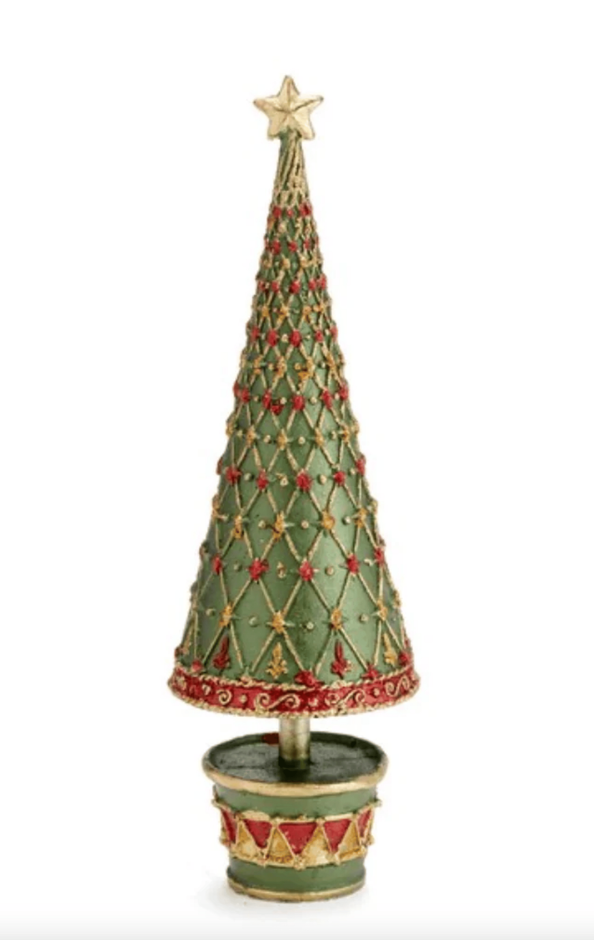 This Dekorasyon Green Fleur De Lis Tree With Drum Base is a sculptural holiday tabletop accent finished in muted green, gold, and red details. The cone-shaped tree features a lattice of fleur-de-lis motifs and a drum-style base topped with a small star for a vintage-inspired look. Dekorasyon brings festive charm to mantels, console tables, or seasonal vignette displays with this decorative piece.