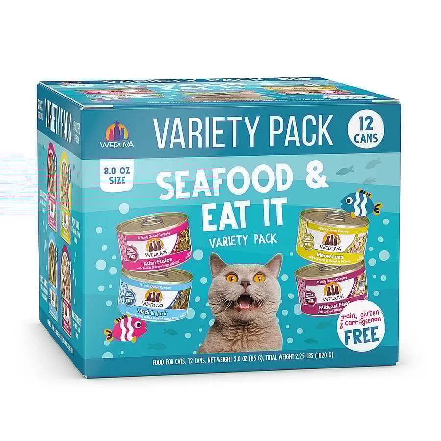 A 12-can collection of Weruva’s ocean-inspired classics, featuring 3 of each recipe: Asian Fusion (tuna & shirasu), Meow Luau (mackerel & pumpkin), Mack & Jack (mackerel & skipjack), and Mideast Feast (grilled tilapia). Each can delivers wild-caught, hand-flaked fish in a hydrating, gravy-rich formula that’s free from grains, gluten, carrageenan, MSG, corn, wheat, and soy.