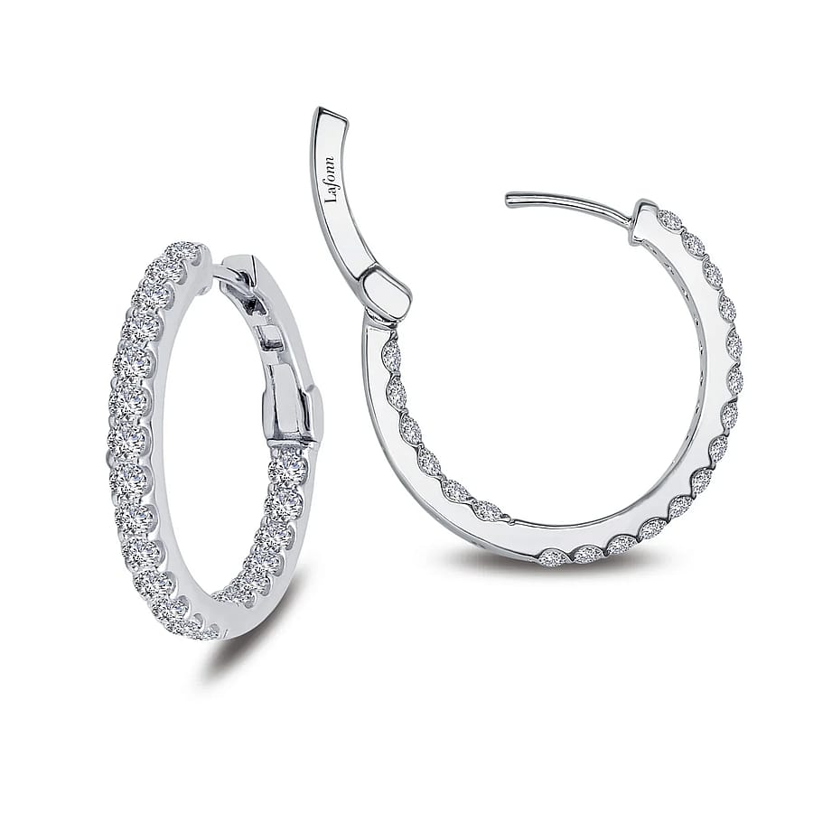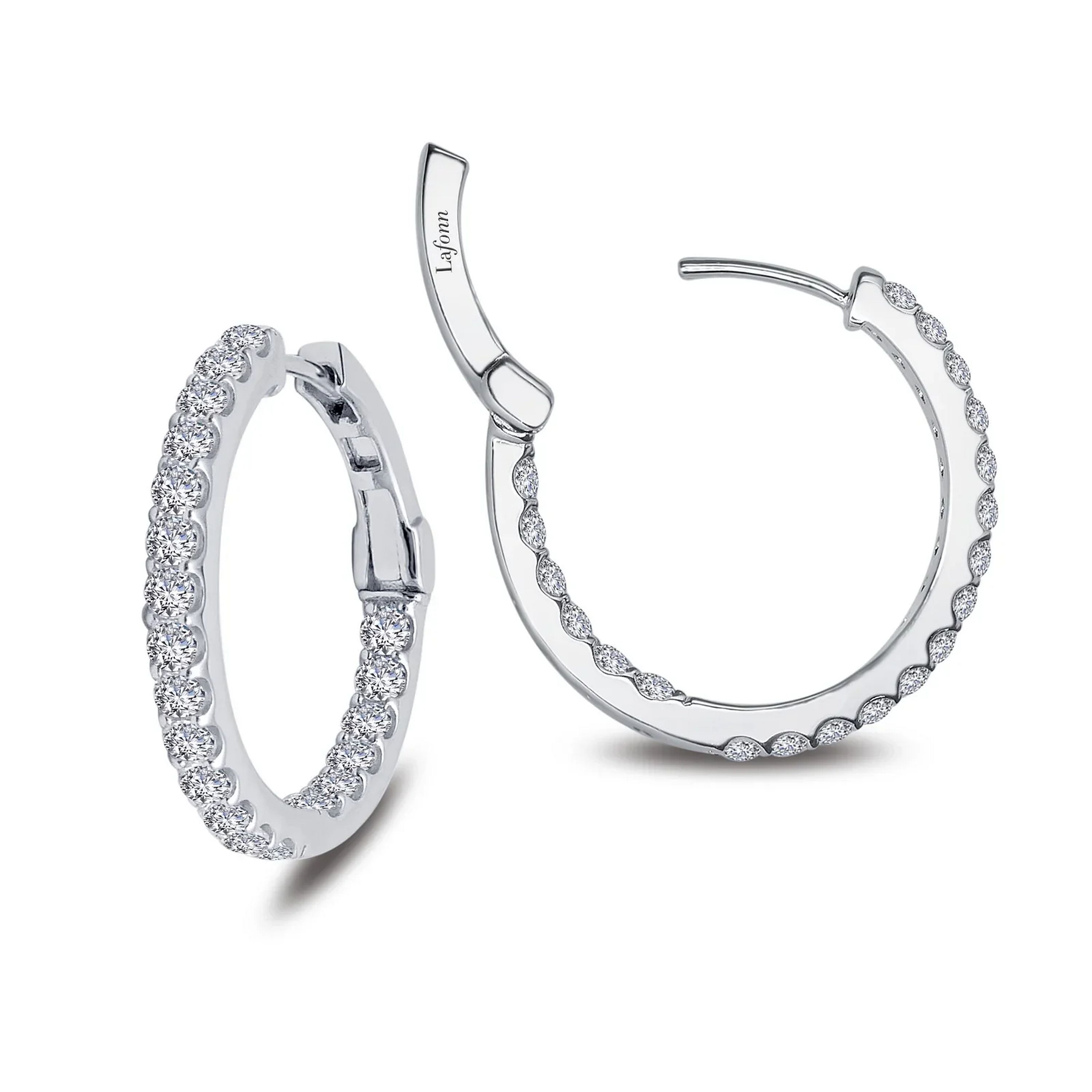 Fun and elegant. These inside out hoop earrings are set with Lafonn's signature Lassaire simulated diamonds in sterling silver bonded with platinum. 25 mm diameter CTW: 2.16