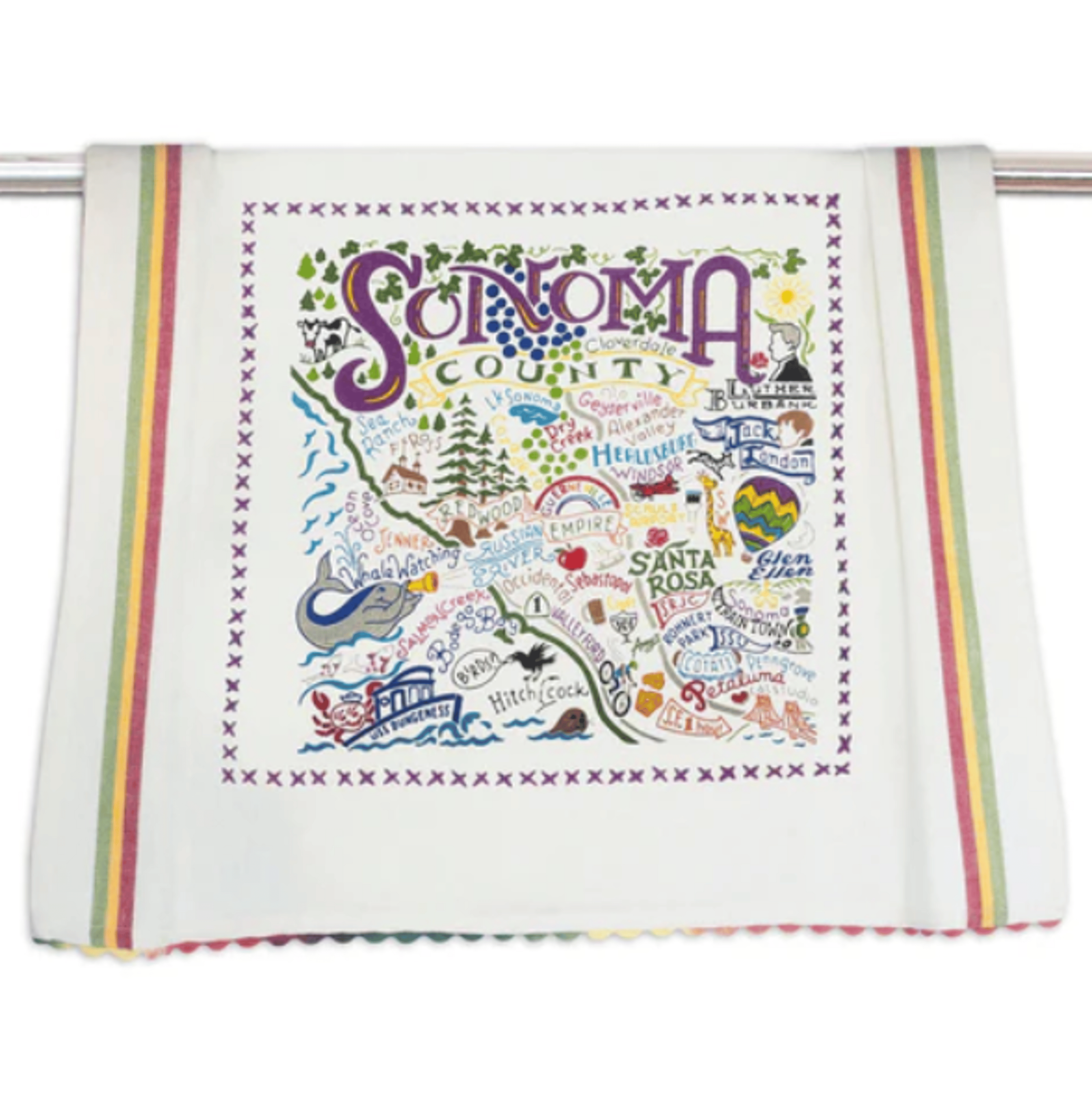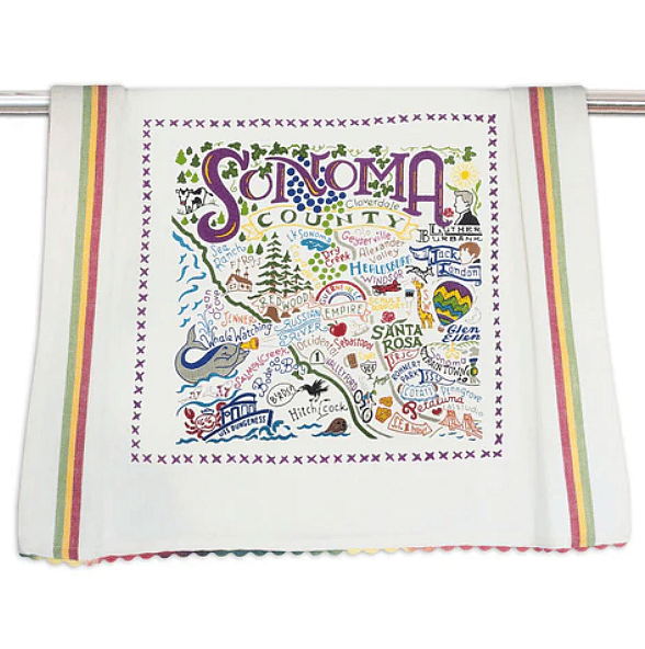 Add a splash of Sonoma County charm to your kitchen with this colorful, vintage-style dish towel — silk-screened with local flair and finished with handcrafted embroidery and rick-rack trim.