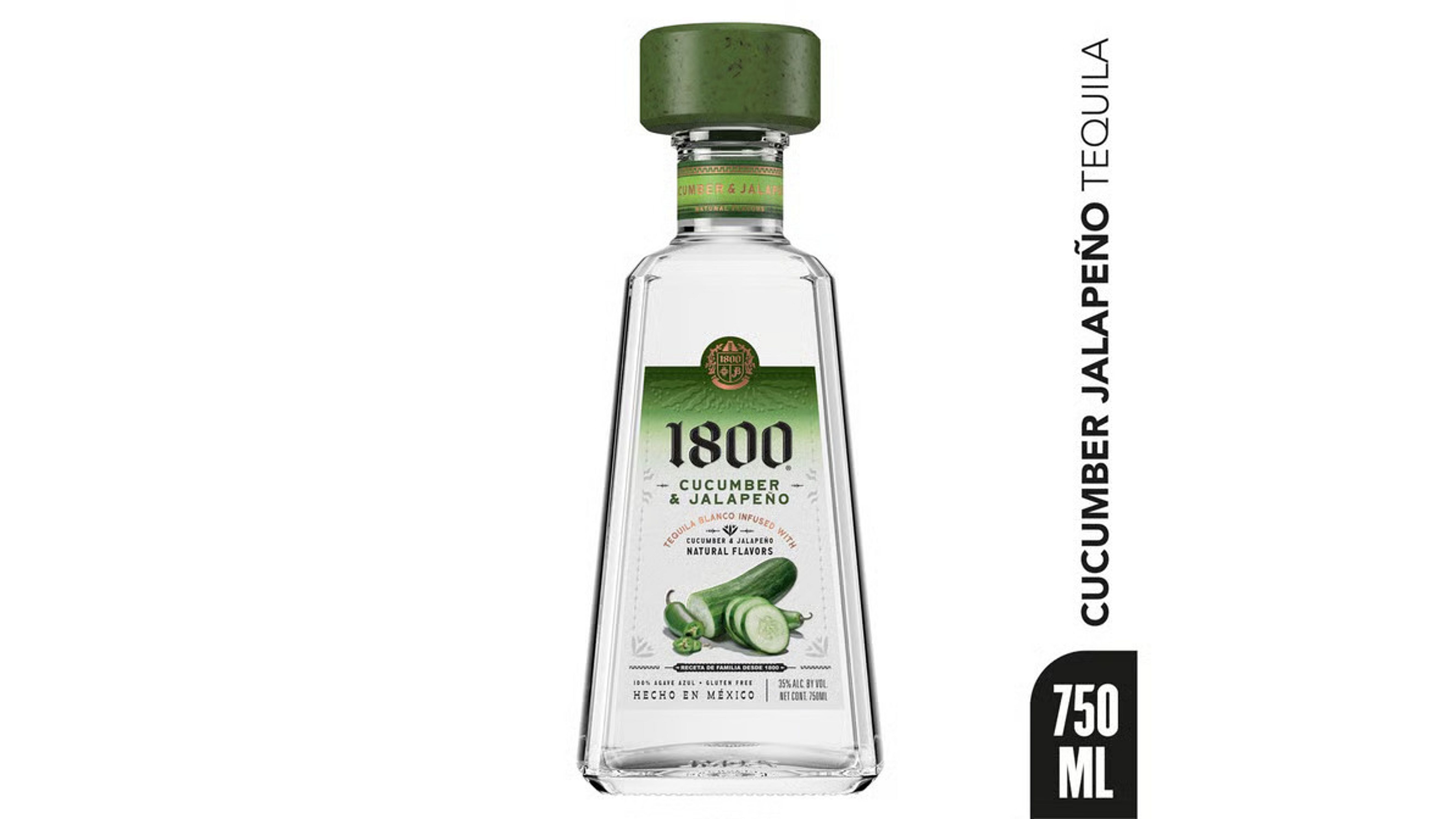 A refreshingly spicy new expression from the #1 selling super-premium tequila and #1 selling flavored tequila brand. 1800 Cucumber & Jalapeño Tequila is 100% blue agave blanco tequila infused with natural flavors of cucumber and jalapeños. A refreshing spicy sensory experience from its herbal, fruity, sweet and spicy aroma to its lingering finish. This unique flavor profile blends fresh cucumber essences with sweet cooked agave and spicy notes of jalapeños. This versatile spirit is best enjoyed in spicy margaritas and in highballs with a simple mix of soda water for a light, refreshing cocktail. (ABV 35% - 70 proof)