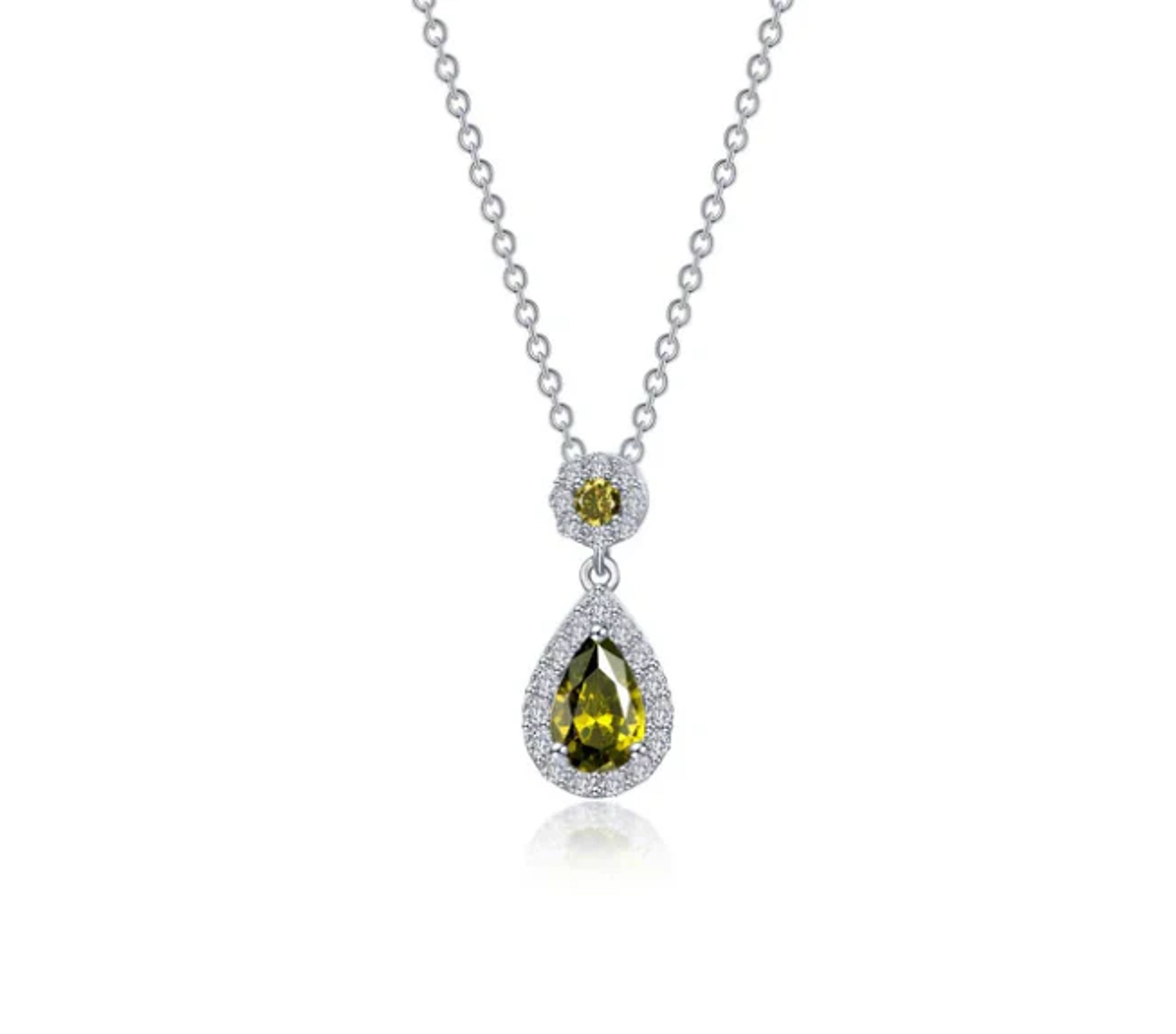 Simple and chic. This charming halo drop necklace features a pear-shaped Swiss Blue simulated diamond surrounded by Lafonn's signature Lassaire simulated diamonds. The necklace is in sterling silver bonded with platinum.