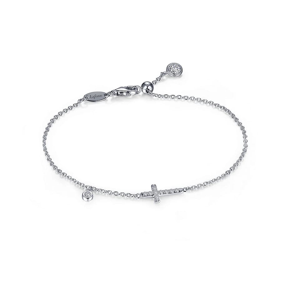 Fun and playful. This adjustable cross bracelet is set with Lafonn's signature Lassaire simulated diamonds in sterling silver bonded with platinum. CTW 0.44