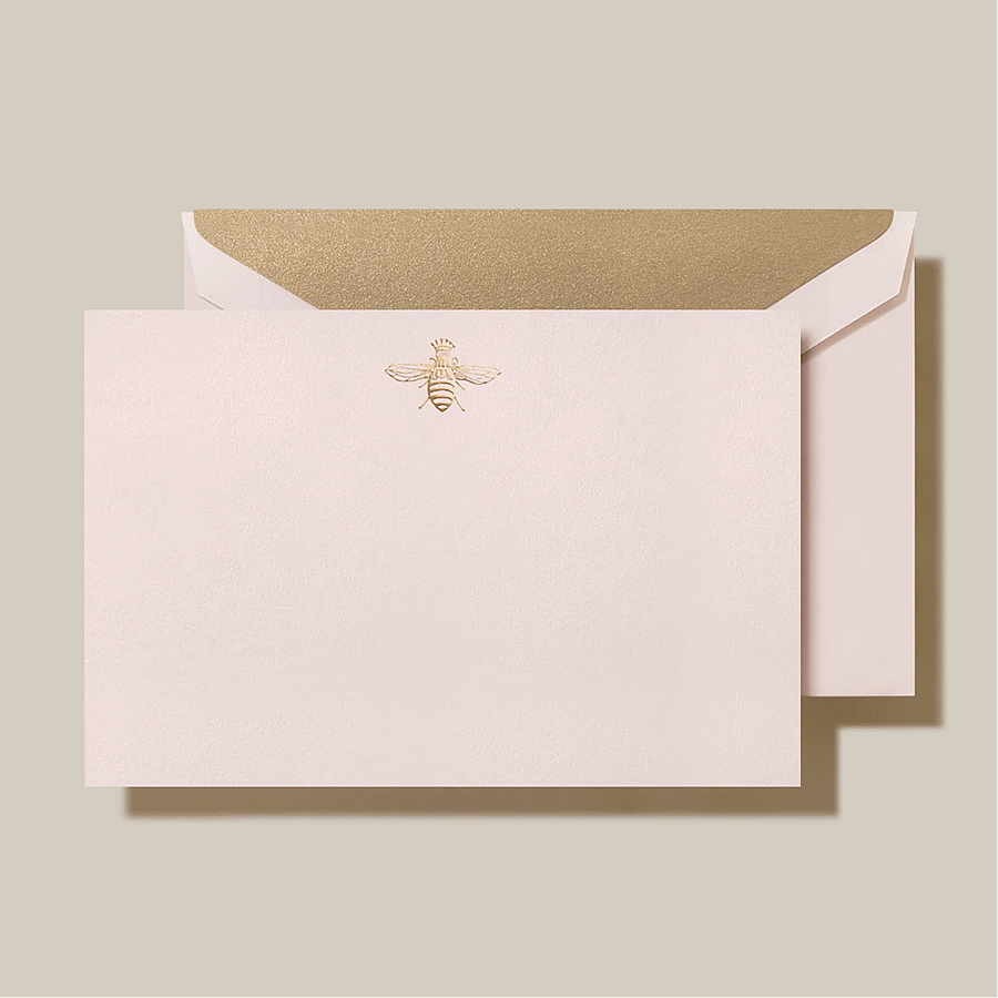 Bees have long been a symbol of optimism, energy, and enthusiasm for life. This royal, feminine twist on the classic symbol is a perfect match for both personal and professional notes. Flat Card 10 cards / 10 lined envelopes 4 1/4 x 6 3/8 100% Cotton Paper Heavy weight paper Made in U. S. A.