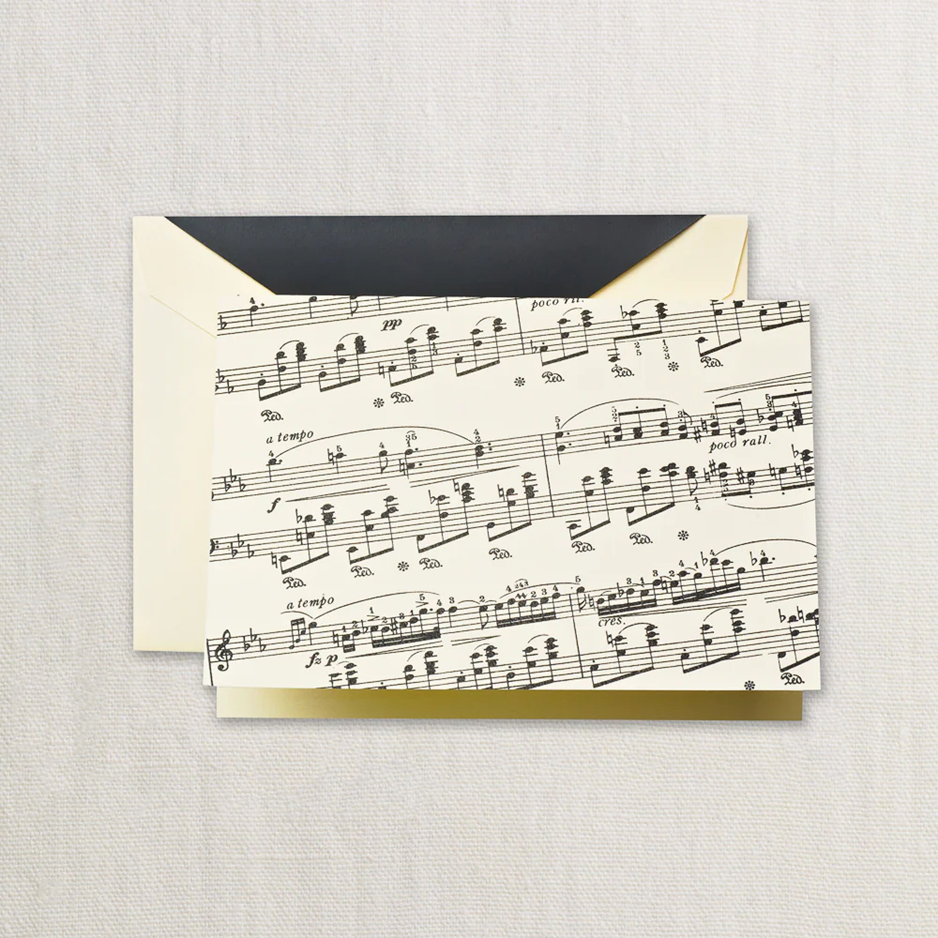 Your handwritten messages will always strike the right chord when you're sending a cheerful Sheet Music Note. Printed using raised, glossy thermography that gently reflects the light on warm white paper that pays homage to classic sheet music, this card is a versatile choice for any music lover. A black envelope liner completes this striking set. Folded Note 10 notes / 10 envelopes Folded Size: 3 13/16 x 5 5/16 Printing Process - Thermographed