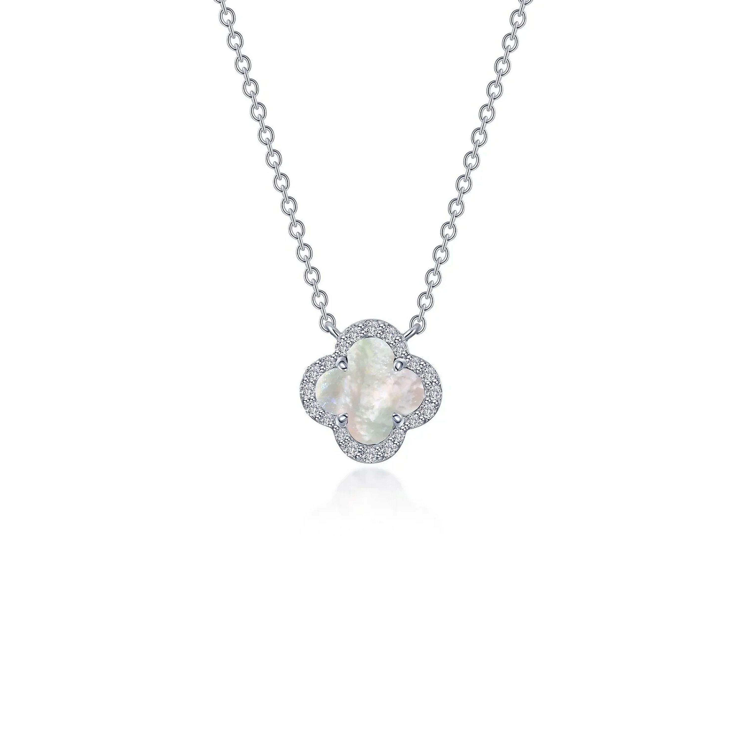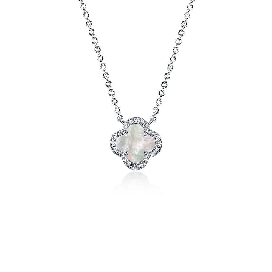 Timeless elegance. This charming adjustable halo necklace features a cultured freshwater mother-of-pearl good-luck symbol surrounded by Lafonn Lassaire simulated diamonds in sterling silver bonded with platinum. CTW: 0.49
