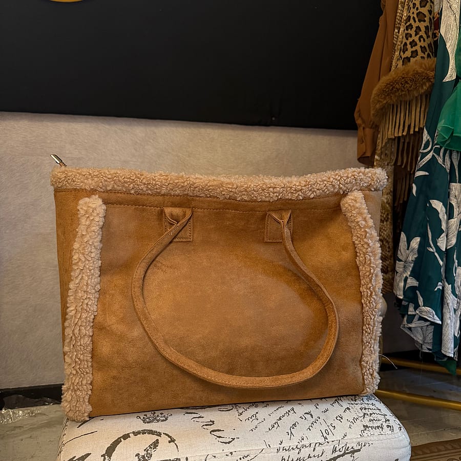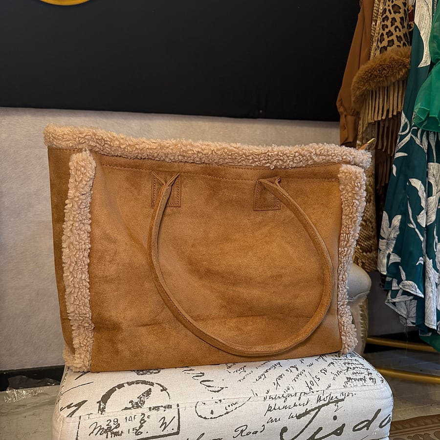 Elevate your everyday style with this chic Faux Suede Sherpa Tote from Chez La Reine. Designed in a warm camel hue with plush sherpa trim, this tote blends cozy textures with a clean, modern silhouette. Perfect for fall, winter, and beyond.