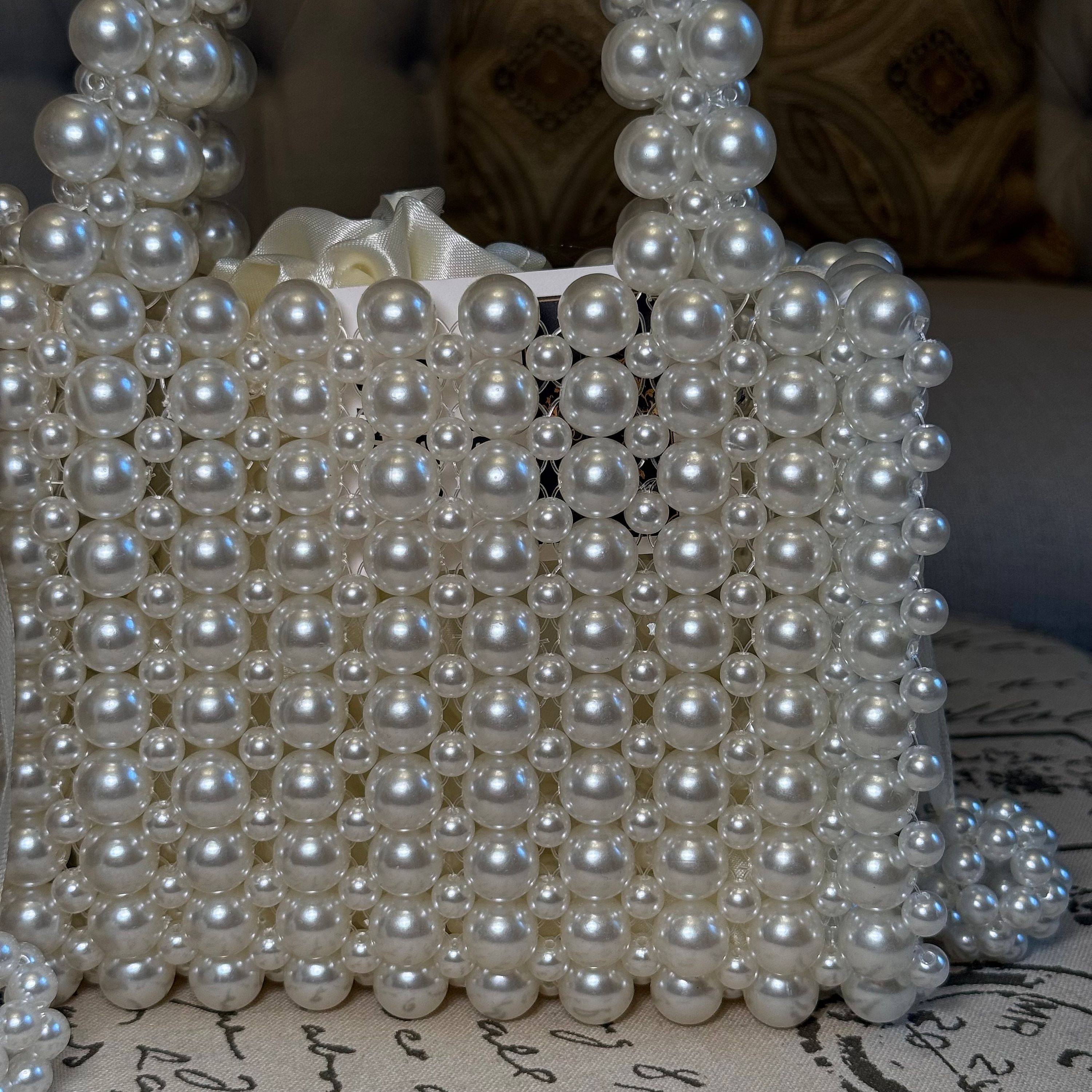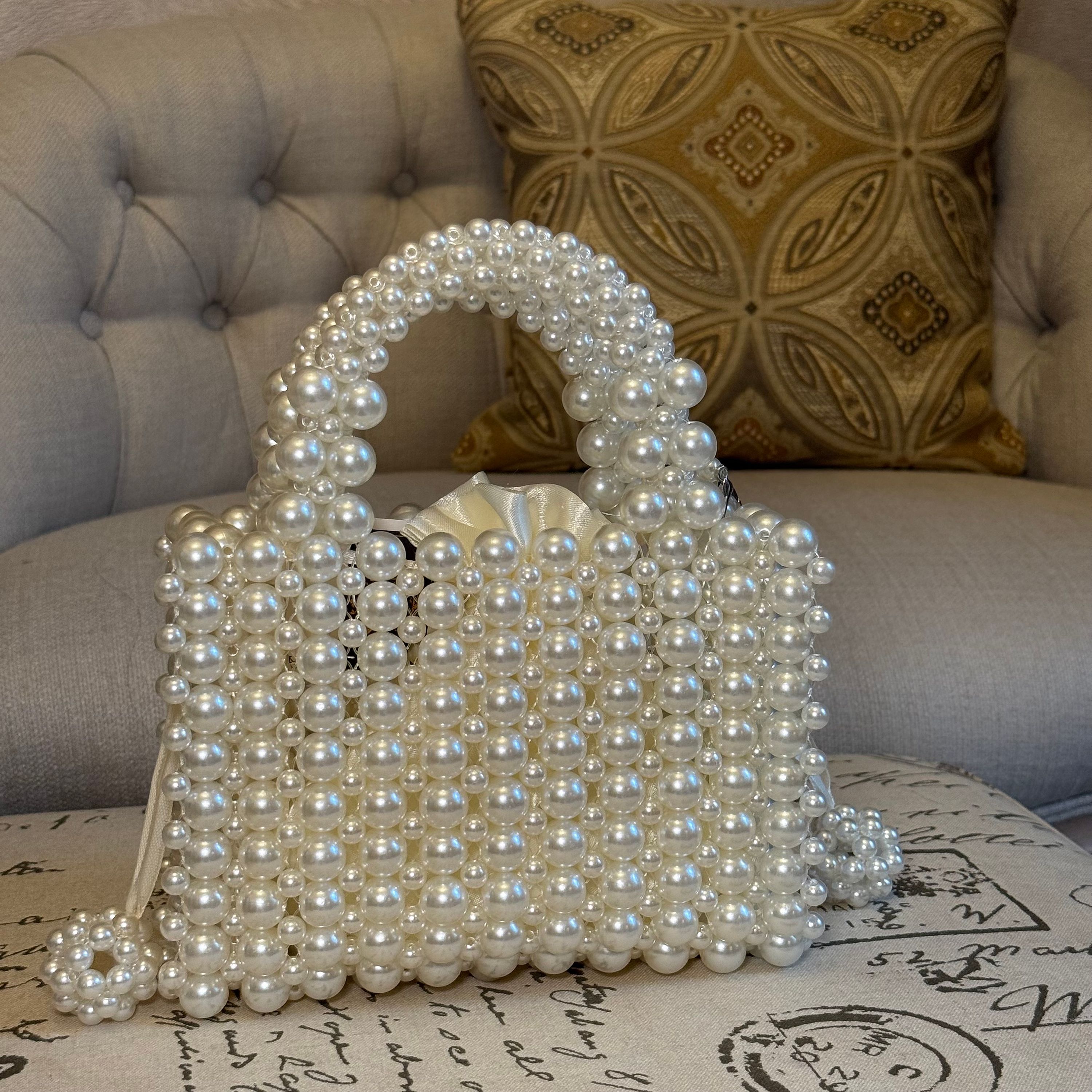 A removable satin pouch sits inside the pearl frame, offering both function and a soft, feminine finish.