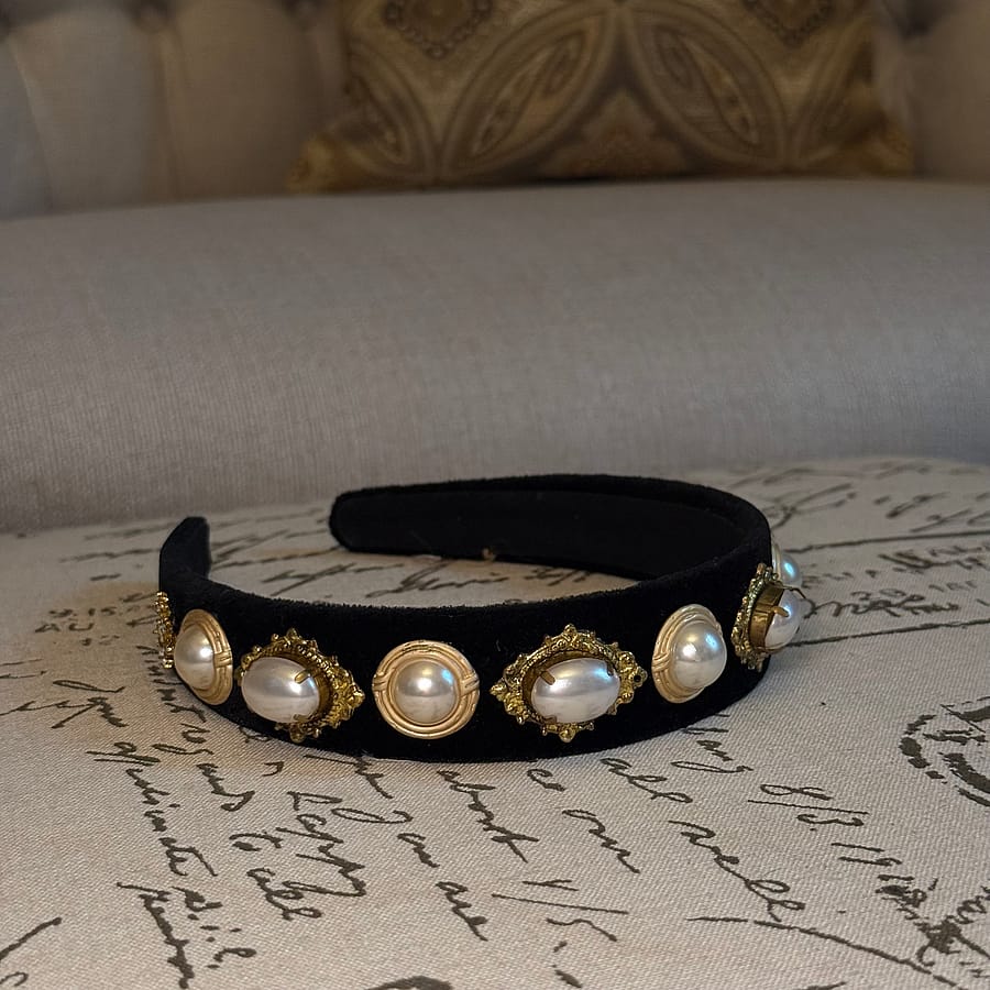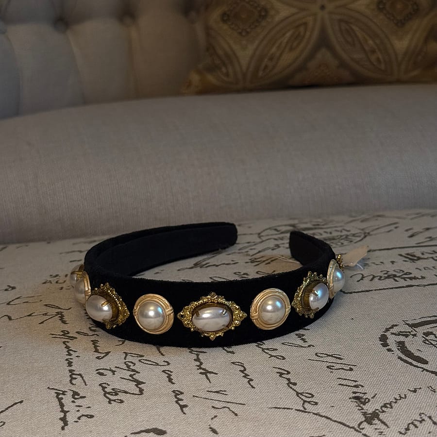 This Royalty Brooch Velvet Headband is the perfect statement piece for elevating any look. Crafted with a plush black velvet band and adorned with oversized pearl and gold brooch-style embellishments, it brings a touch of regal glamour to your everyday style.