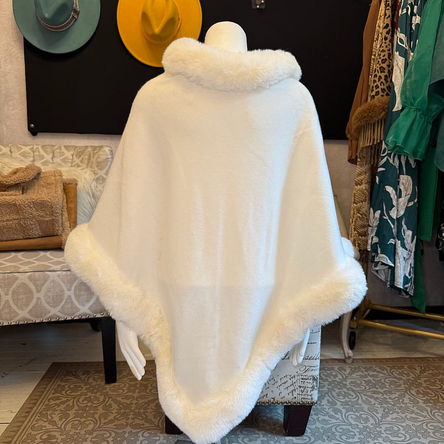 Wrap yourself in elegance and warmth with this luxurious Faux Fur Trim Poncho. Its soft, draped silhouette and plush faux fur accents create an effortlessly chic look perfect for the colder seasons.