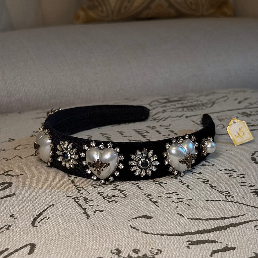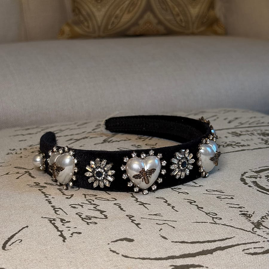 Rule every room with this stunning Royalty Queen Bee Brooch Velvet Headband — a bold, elegant accessory designed to make you feel instantly regal. Crafted from plush black velvet and adorned with pearl heart brooches, sparkling crystal floral accents, and antique gold bee detailing, this headband delivers queen-level glamour in one effortless piece.