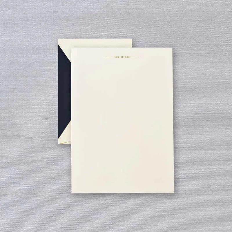 Crane's fine, all-cotton half sheets are just the right size for composing a thoughtful letter. Engraved at the top with a gold ornamental motif and lined in classic navy, this stationery set is just the thing to have on hand when inspiration strikes. Half sheet 10 sheets / 10 lined envelopes 5 5/16 x 7 5/8 100% Cotton Paper Light weight paper Made in U. S. A.
