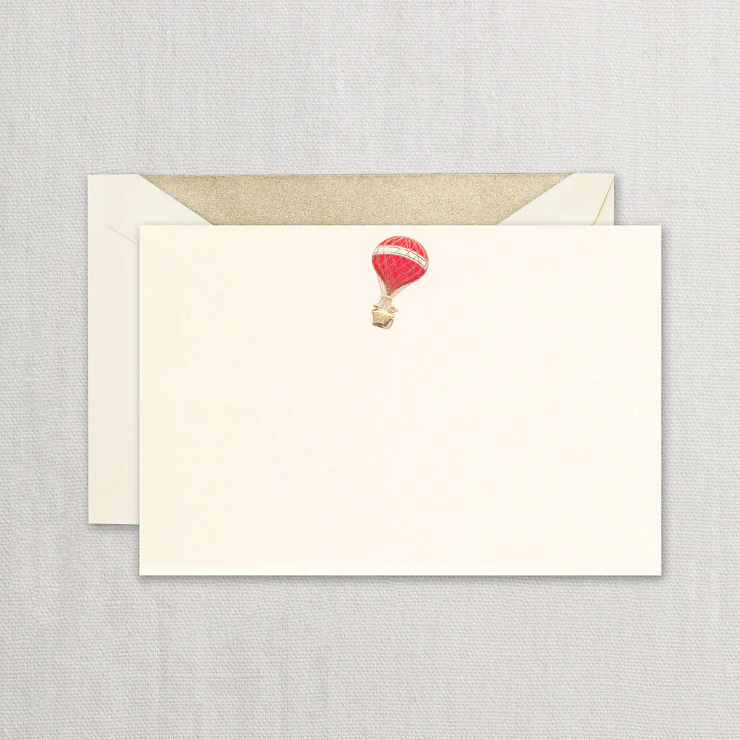 Hot air balloons are a sight that would fill anyone with childlike wonder and delight. Expertly engraved in red and gold on this heavyweight, silky-soft correspondence card, this playful motif is designed to inspire. You might find yourself looking for excuses to send a handwritten note with this sweet card in your collection. Flat Card 10 cards / 10 lined envelopes 4 1/4 x 6 3/8 100% Cotton Paper Heavy weight paper Made in U. S. A.