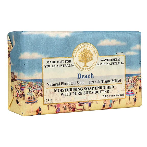 Happy Days at the Beach. Warm golden sand, clean fresh breezes and an endless blue ocean. All captured in these fabulous Beach Soap bars. 200g/7oz when packed French-milled (triple-milled) bar that is long lasting, non-drying and has an extra creamy lather Enriched with Organic Shea Butter