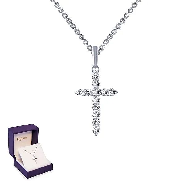 This Holiday Special includes a classic 0.36 CTW cross necklace and a Lafonn necklace box. The necklace is set with Lafonn's signature Lassaire simulated diamonds in sterling silver bonded with platinum. Holiday Special price of $99 per set. Regular price of $125 if sold separately.