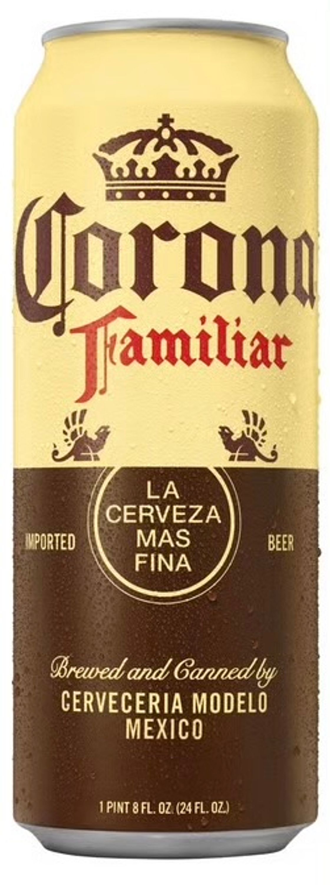 Rooted in authentic, rich heritage, Corona Familiar Lager Beer is a bright, golden-colored pilsner that is balanced with moderate bitterness and a light finish. A Mexican lager style beer, Corona Familiar combines a full-flavored, light- to medium-body lager beer with the bright, crisp taste for which Corona beer is known. Smooth to drink, this Mexican beer's light carbonation and slight head make it the perfect complement to Mexican food. This imported beer is ideal for gatherings with close friends and family, where the tradition of sharing creates meaningful experiences. Conveniently portable 24 oz beer cans make this traditional cerveza the perfect tailgating beer. Containing 154 calories per 12 oz serving and 4.8% alcohol by volume, Corona Familiar is the taste of a great tradition. Drink responsibly. Corona Familiar® Beer. Imported by Crown Imports, Chicago, IL