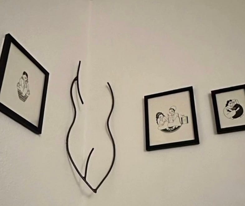 Steel sculpture~approximately 2' tall made with 5/16" welded round bar, finished with a gloss black paint. Mounts with small finish nails, can be hung indoor or outdoor.