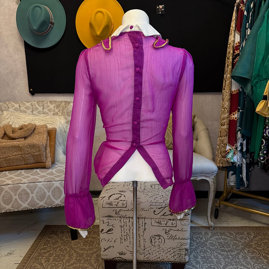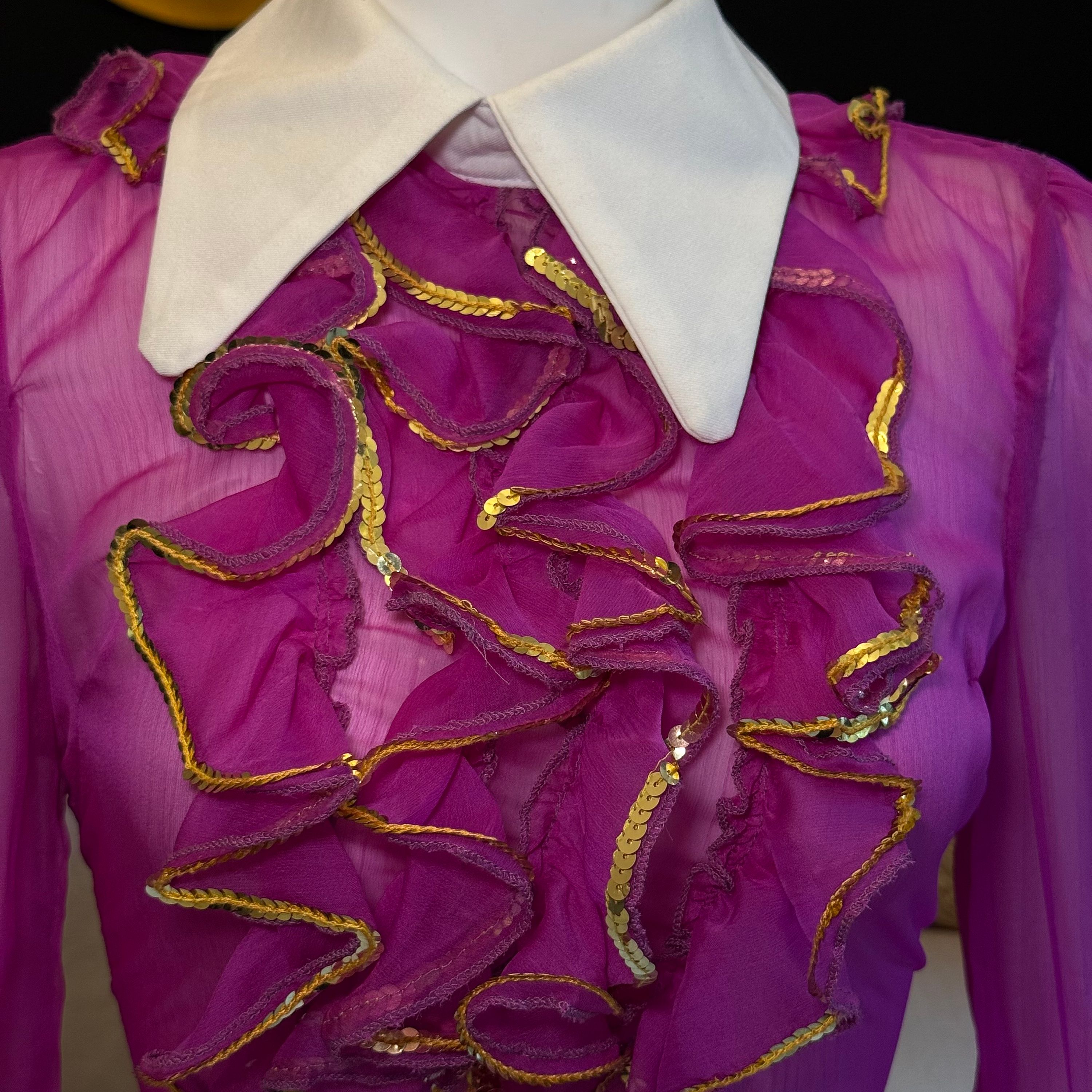Turn heads in this chic chiffon ruffle top, designed in a vibrant purple hue and finished with shimmering gold accents. The crisp white lapel adds a sophisticated contrast, making this piece perfect for both bold everyday style and standout evening looks.