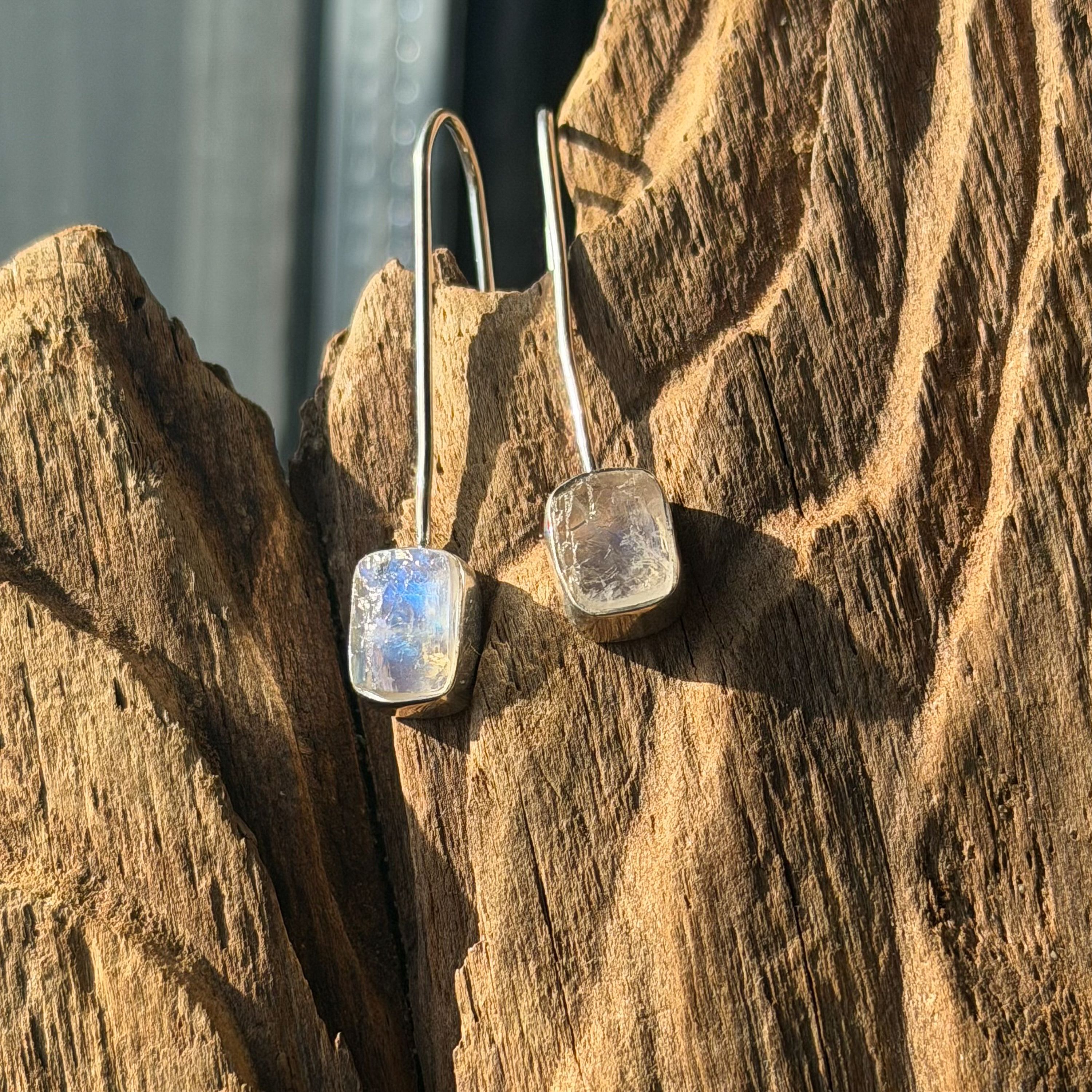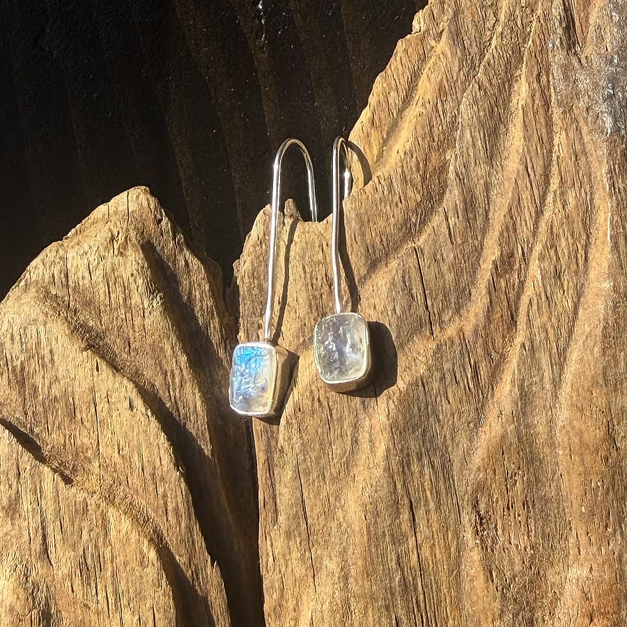 These Raw Moonstone Dangle Earrings are a stunning expression of handcrafted artistry. Designed by Vintage Mermaid, each earring features an organically shaped raw moonstone set in genuine 925 sterling silver, allowing the stone’s natural iridescence to take center stage.