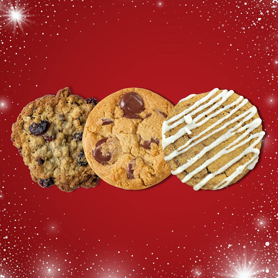 Savor the season with a festive box of Cranberry Oatmeal, Chocolate Chunk & Gingersnap Cookies, the perfect holiday treat! Each box includes 30 freshly baked cookies (10 of each flavor) for just $30! Last day to place your order is December 14th