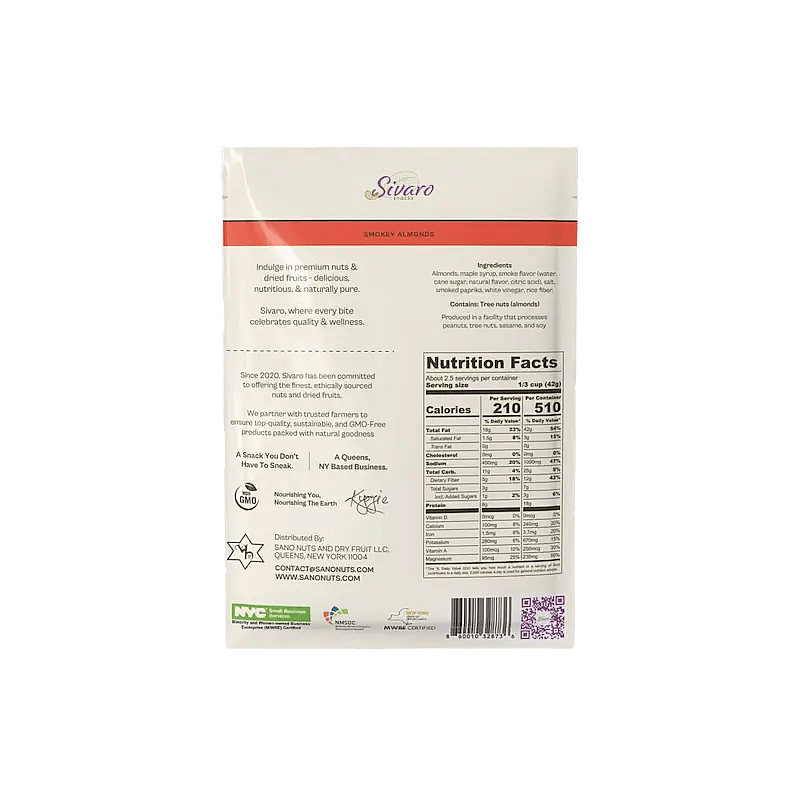 Ingredients: Almonds, maple syrup, smoke flavor (water, cane sugar, natural flavor, citric acid), salt, smoked paprika, white vinegar, rice fiber. Contains: Tree Nuts (Almonds).
