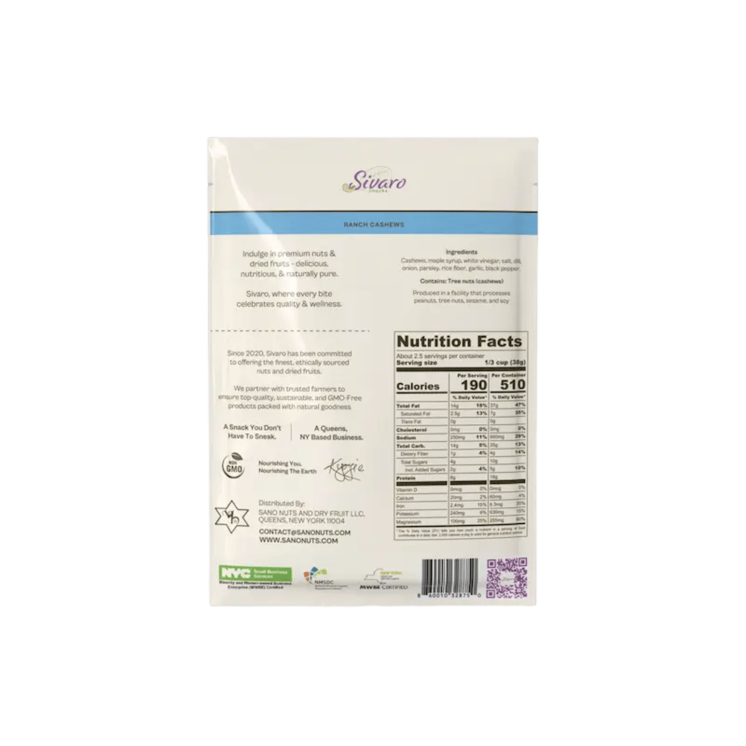 The Flavor: All the zesty goodness of ranch (dill, garlic, onion) dusted onto a buttery roasted cashew.
