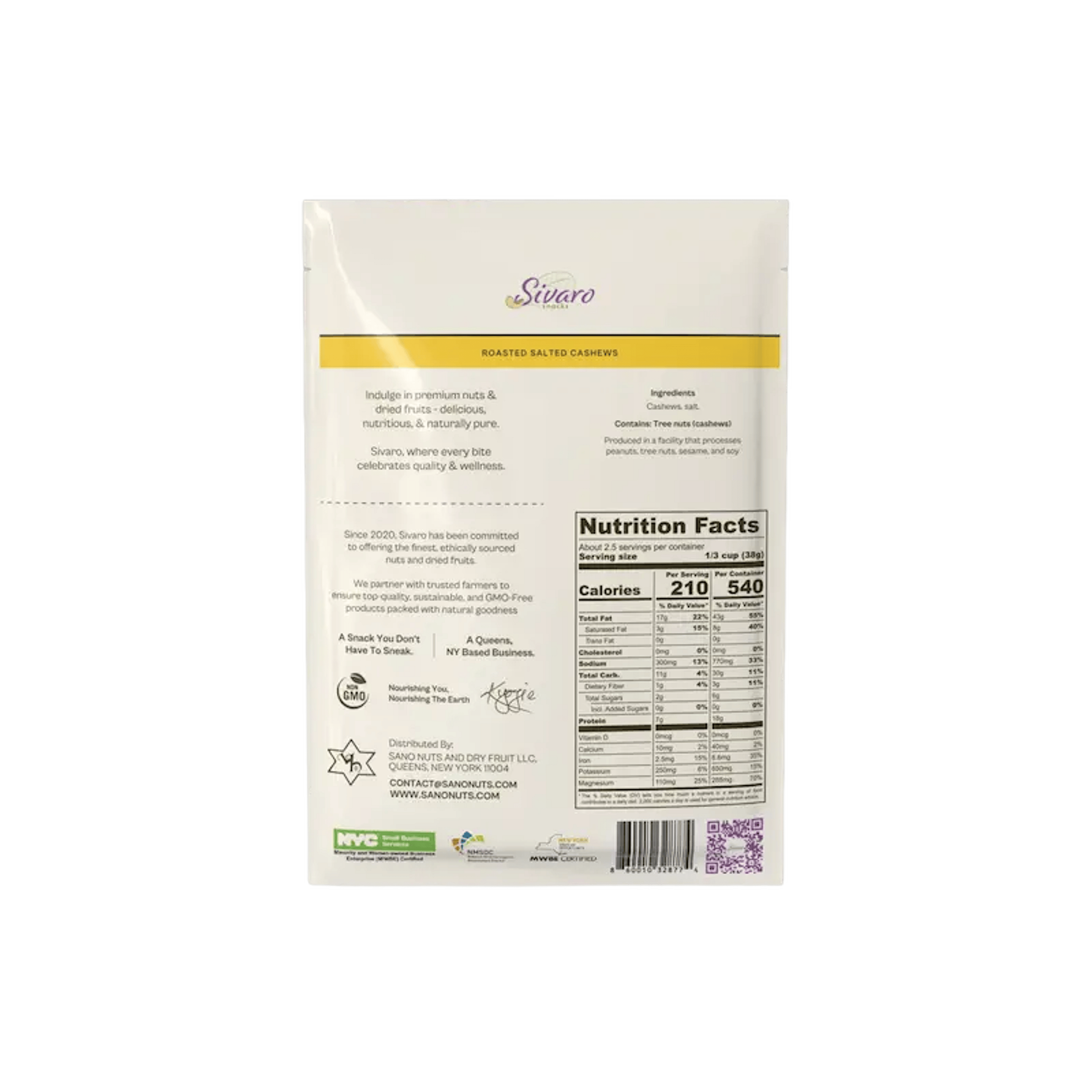 Ingredients: Cashews, Salt Contains: Tree Nuts (Cashews).