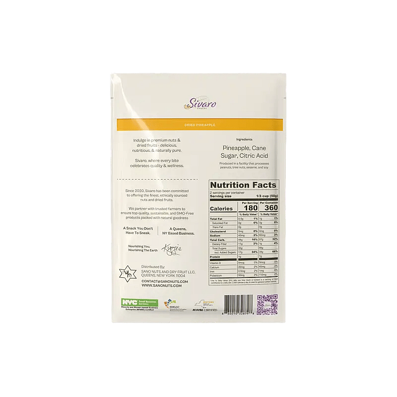 Ingredients: Pineapple, Cane Sugar, Citric Acid (Preserves Freshness). Produced in a facility that processes peanuts, tree nuts, sesame, and soy.