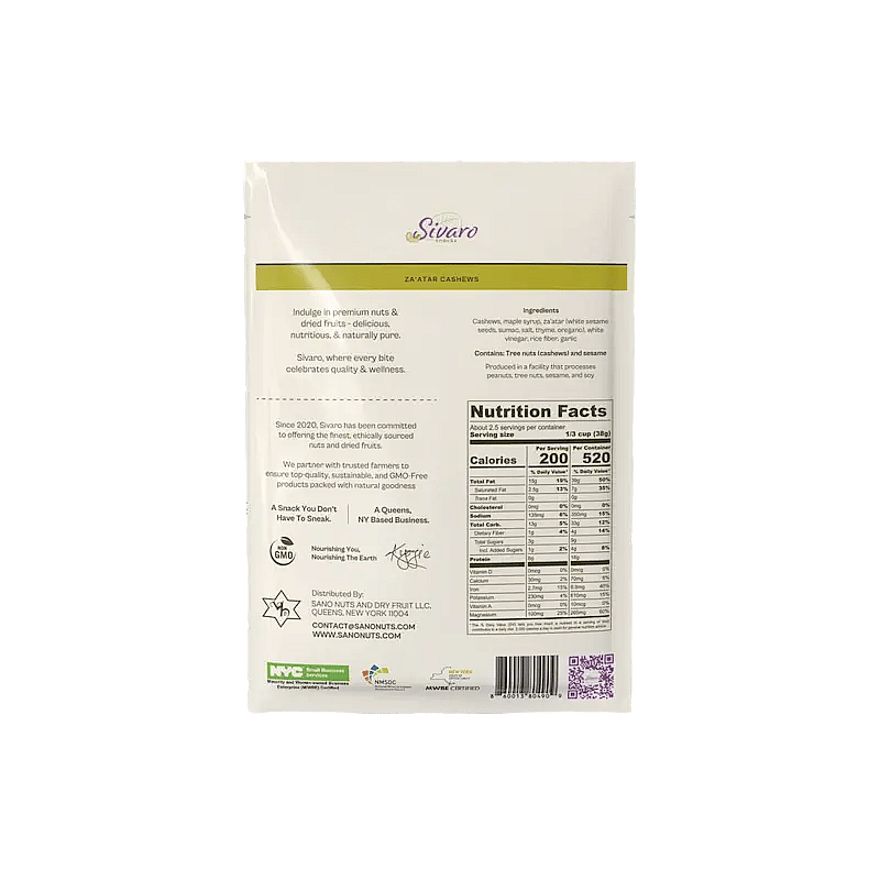 Ingredients: Cashews, Maple Syrup, Za'atar (White Sesame Seeds, Sumac, Salt, Thyme, Oregano), White Vinegar, Rice Flour, Garlic Contains: Tree Nuts (Cashews, Sesame).