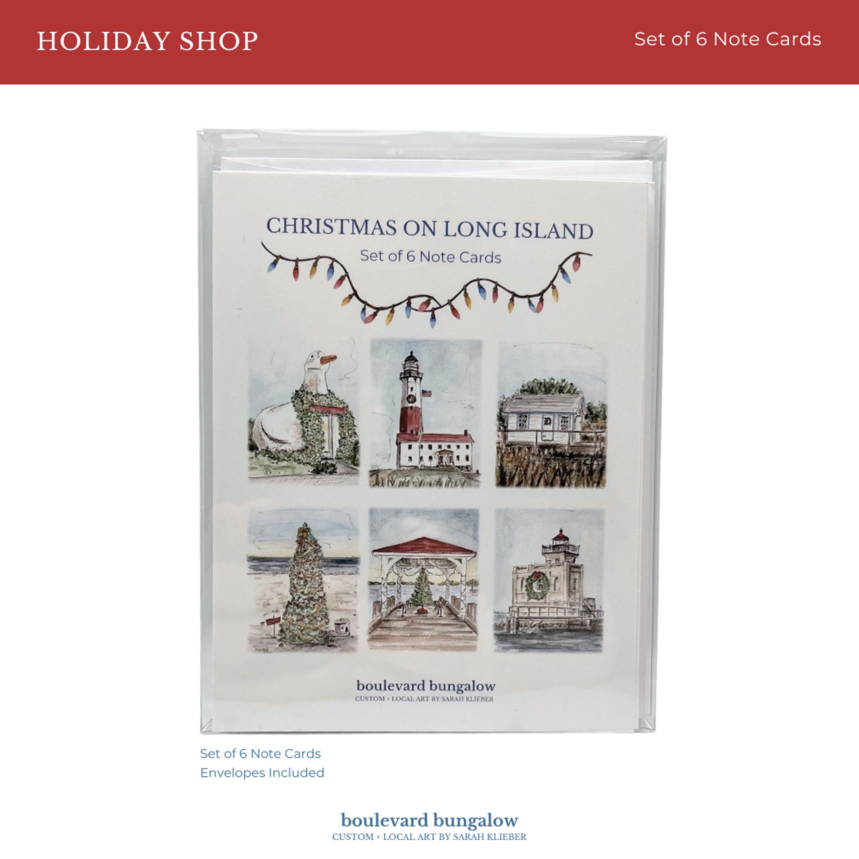 • Set includes 6 premium note cards featuring unique Long Island holiday scenes