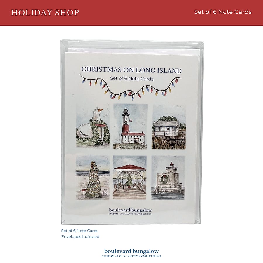Share the charm of Long Island during the holiday season with this beautifully illustrated set of note cards. Each card features a different Long Island landmark, hand-drawn and painted by local artist Sarah Klieber of Boulevard Bungalow. These cards make a thoughtful gift for anyone who loves Long Island or wants to send festive, hometown-inspired greetings.