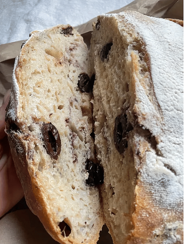 Made with regionally sourced, Stone Milled Organic Wheat (Hard Red Spring Wheat), filtered water, salt and a natural leavening agent otherwise known as a levain or starter and organic kalamata olives.
