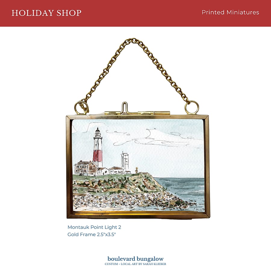 Capture the calm beauty of the East End with this printed miniature featuring a scenic Montauk Point water view. Set in a gold metal floating frame (2.5"×3.5") with a decorative hanging chain, it can be used as a Christmas ornament or hung as miniature wall décor.
