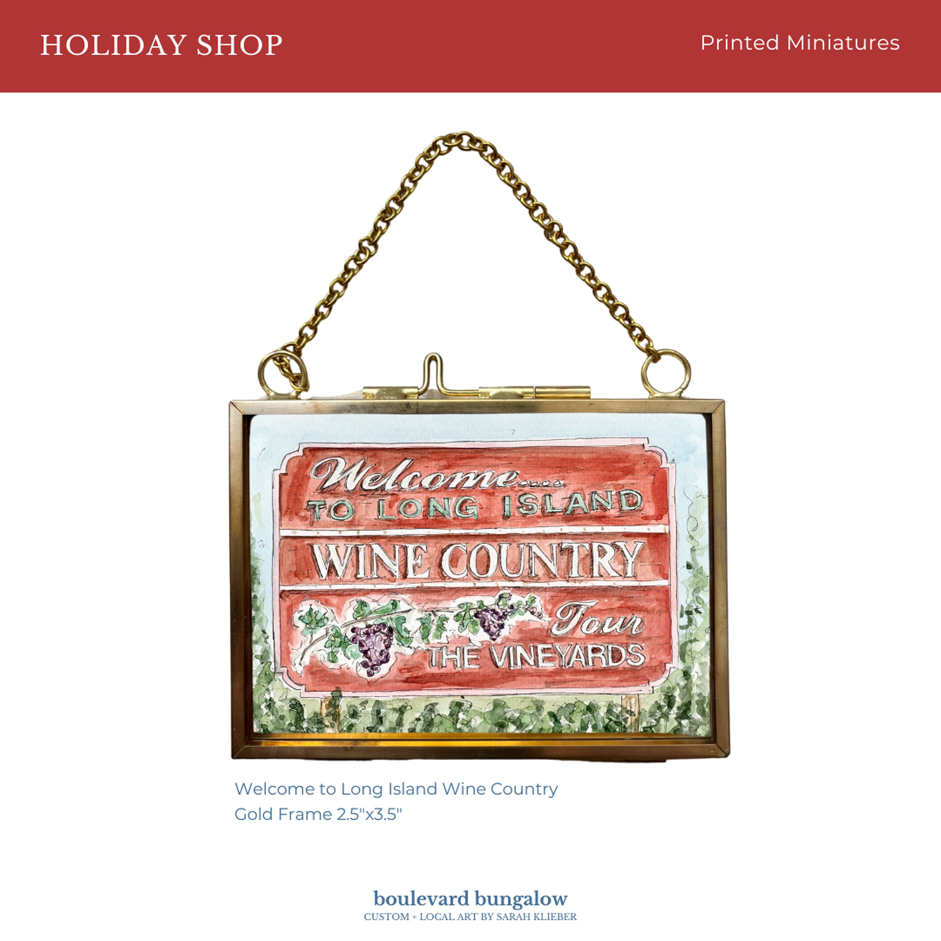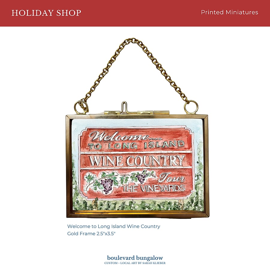 Celebrate the beauty of the North Fork with this printed miniature of the Welcome to Wine Country sign. Displayed in a gold floating metal frame (2.5"×3.5") with a hanging chain, it works as both ornament and miniature wall art.