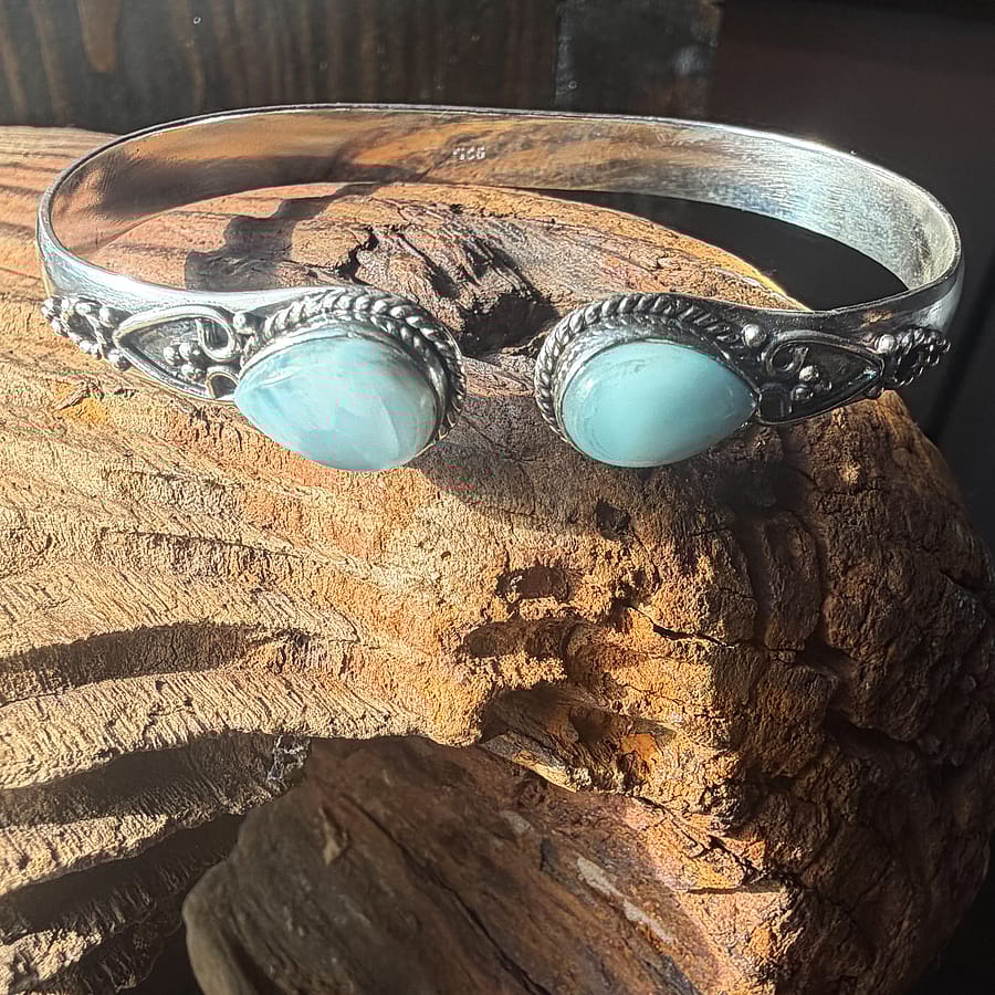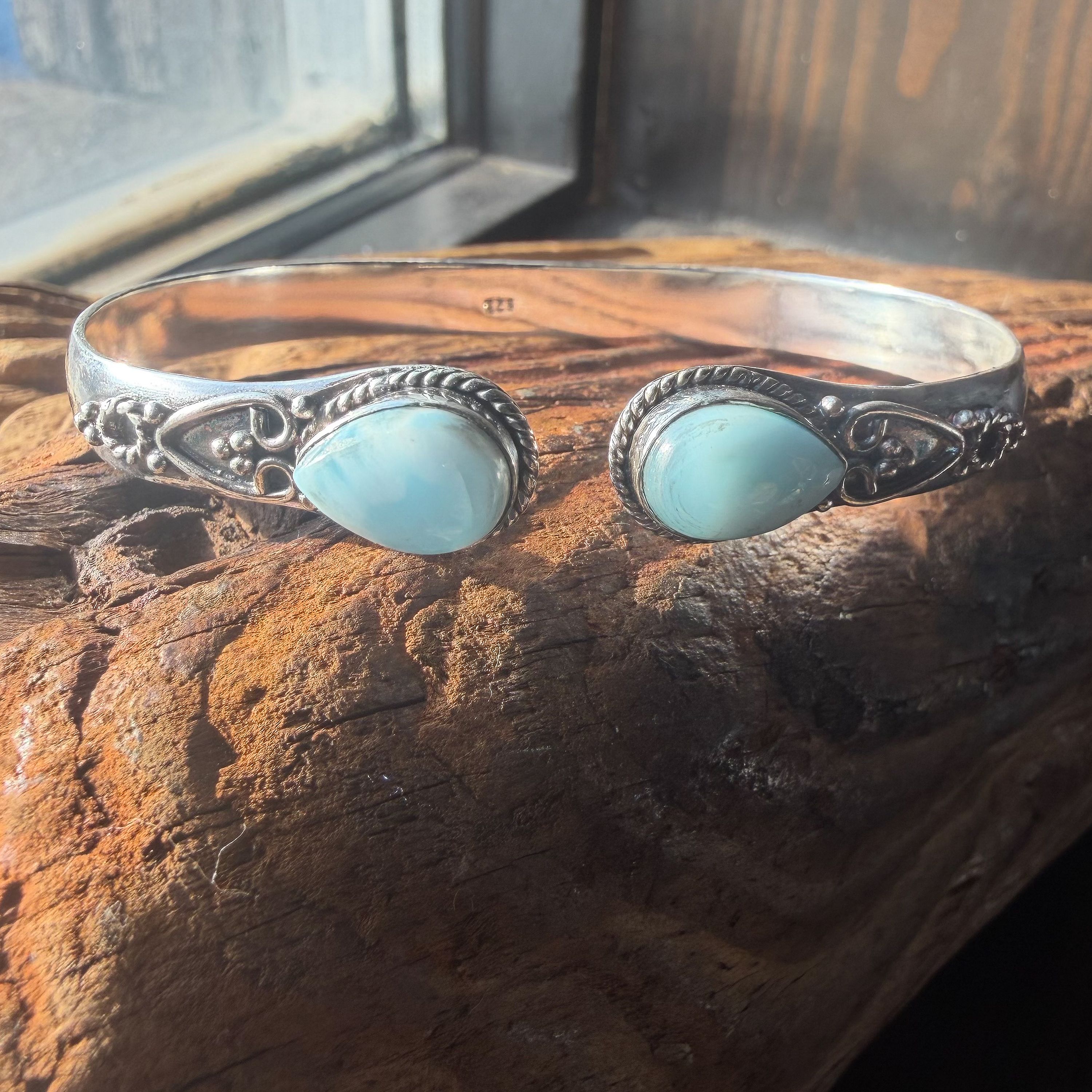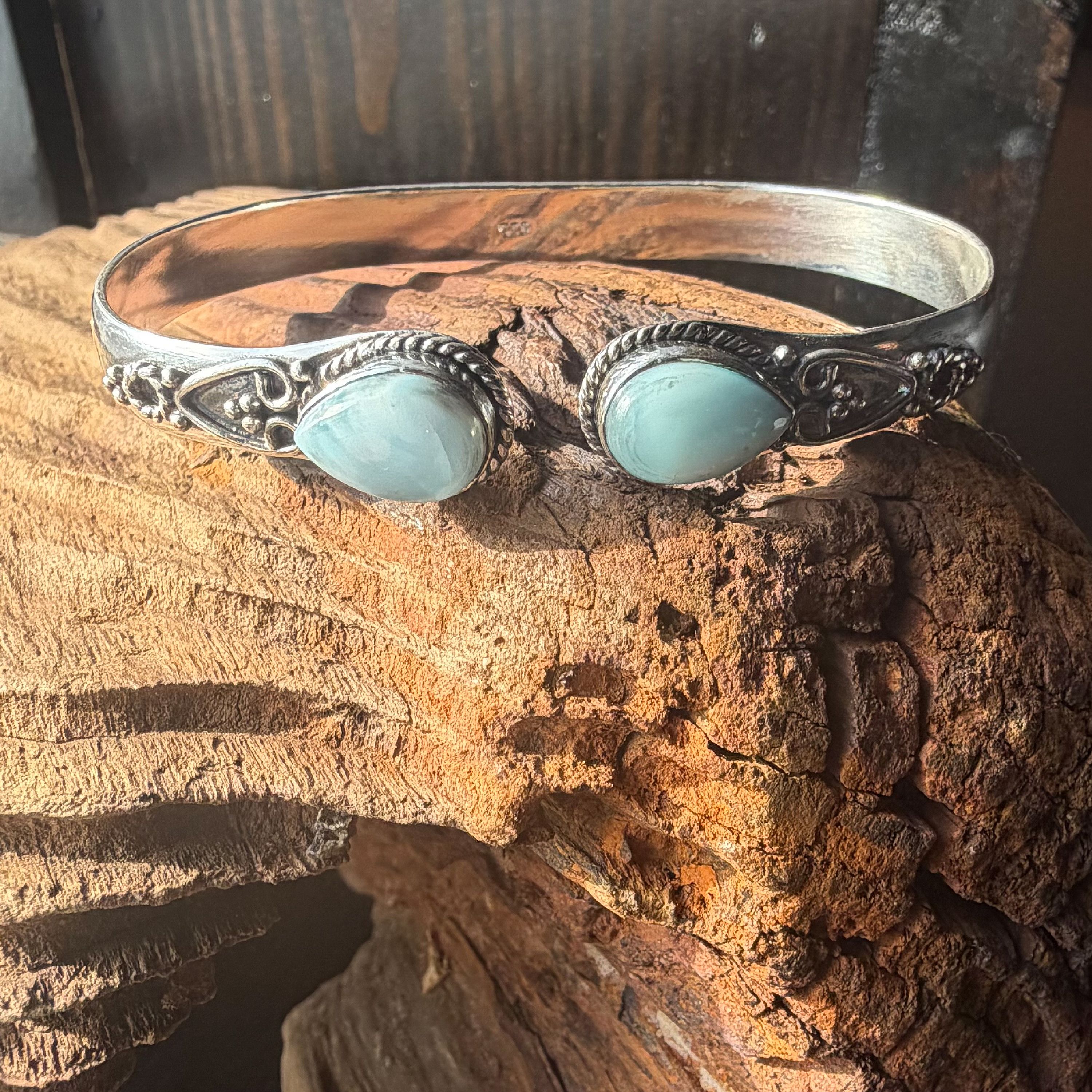 This handcrafted Larimar bangle brings ocean-inspired elegance to the wrist with two polished Larimar stones set in detailed .925 sterling silver. Each stone showcases natural soft-blue tones reminiscent of Caribbean waters, making this piece both calming and captivating.