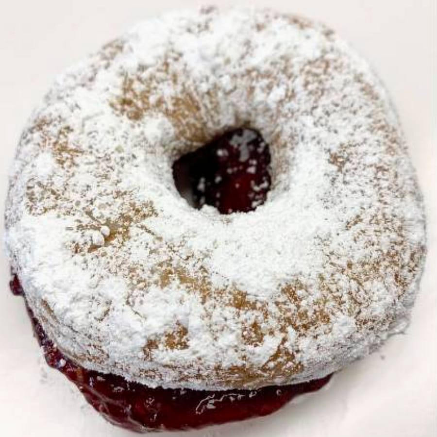 Vanilla donut, raspberry jelly, powdered sugar.