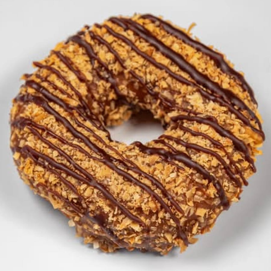 Vanilla donut, caramel icing, toasted coconut, chocolate drizzle.