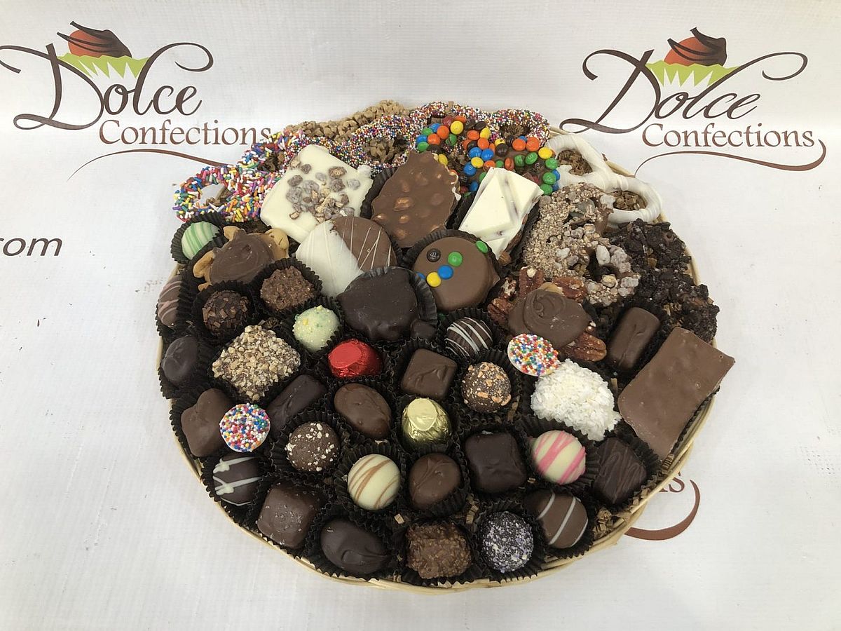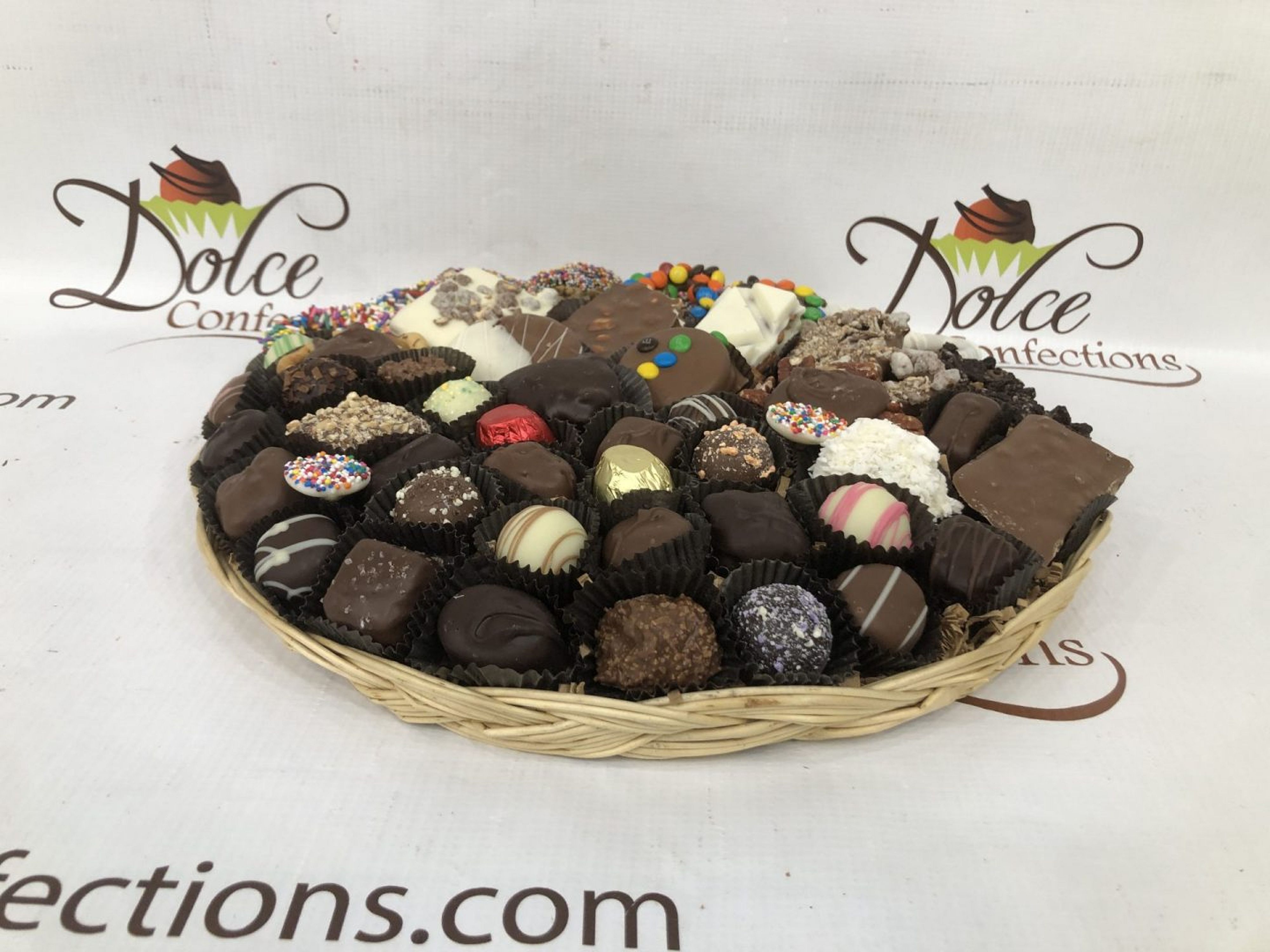 Approximately 50 pieces of chocolate, pretzels and cookies totaling 2.25 lbs. arranged in a round tray measuring 14 inches. Due to product availability, actual basket may differ from picture.