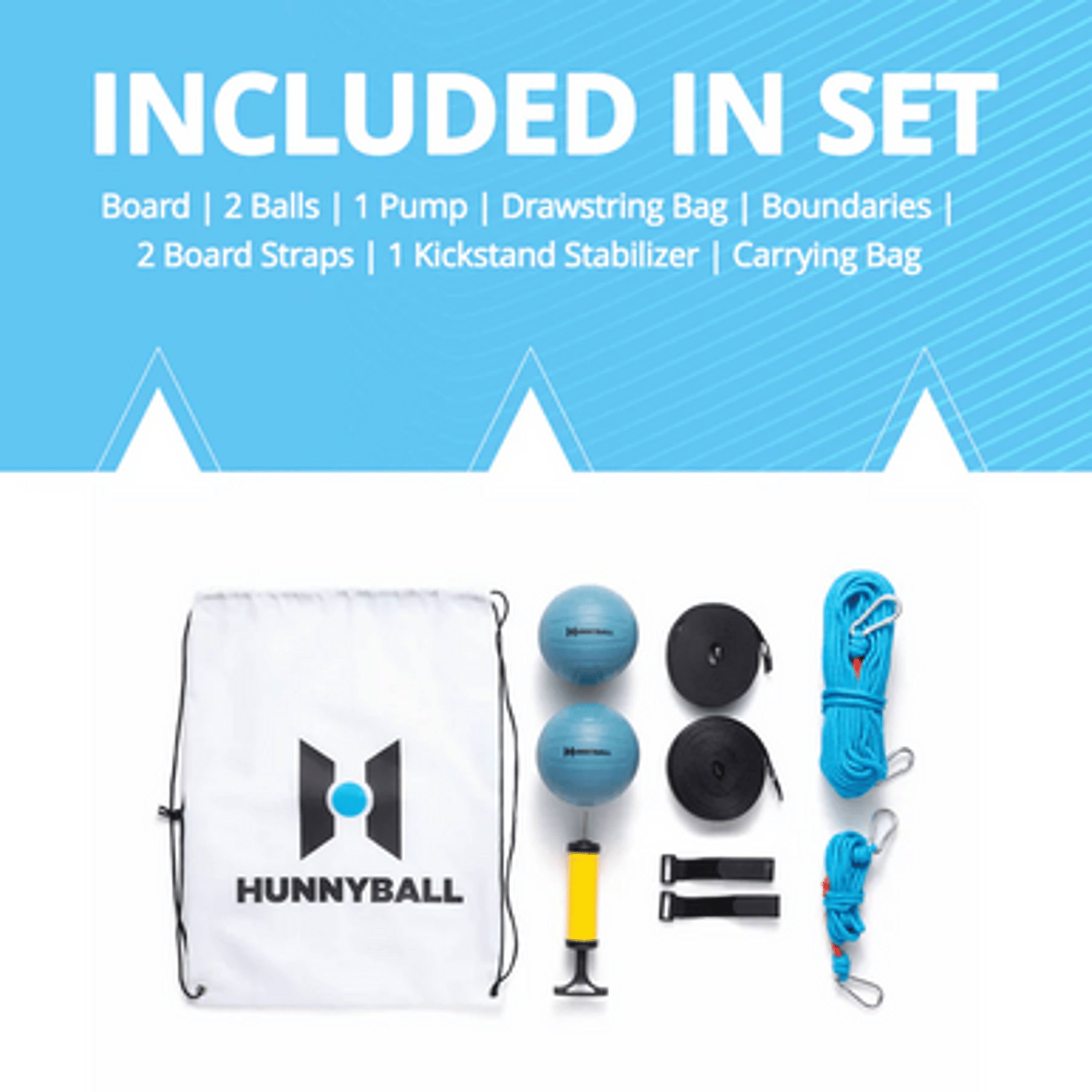 Baltic Birch plywood, precision CNC cut. Includes: Board, 2 Hunnyball balls, hand pump, drawstring accessory bag, crease/baseline straps, kickstand stabilizer, large carry bag. Assembly time: 2 minutes. Players: 2v2 standard; expandable to 3v3.